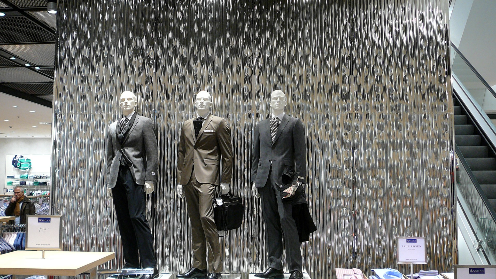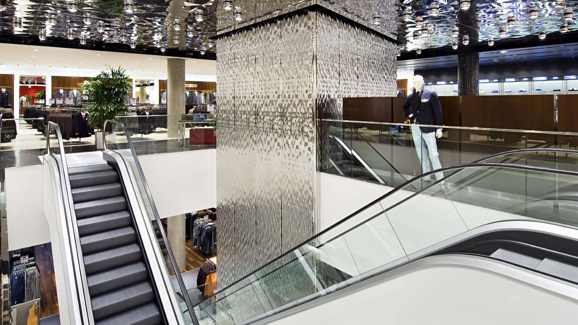 Das Modehaus Ansons präsentiert sich in einer außergewöhnlichen Architektur. Als Highlight fällt sofort die Verkleidung des Aufzugschachtes mit der “Wasserwelle XL” auf.