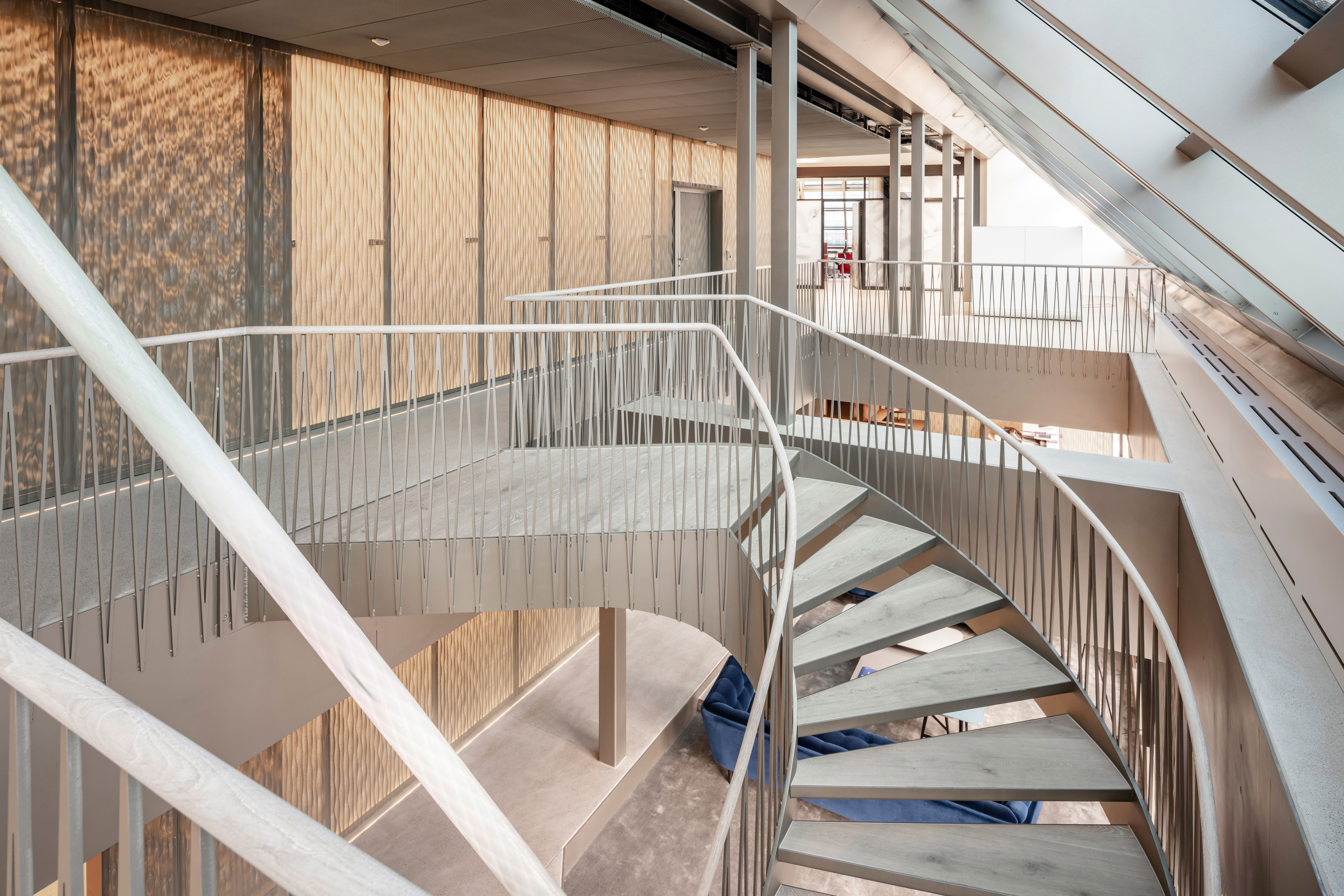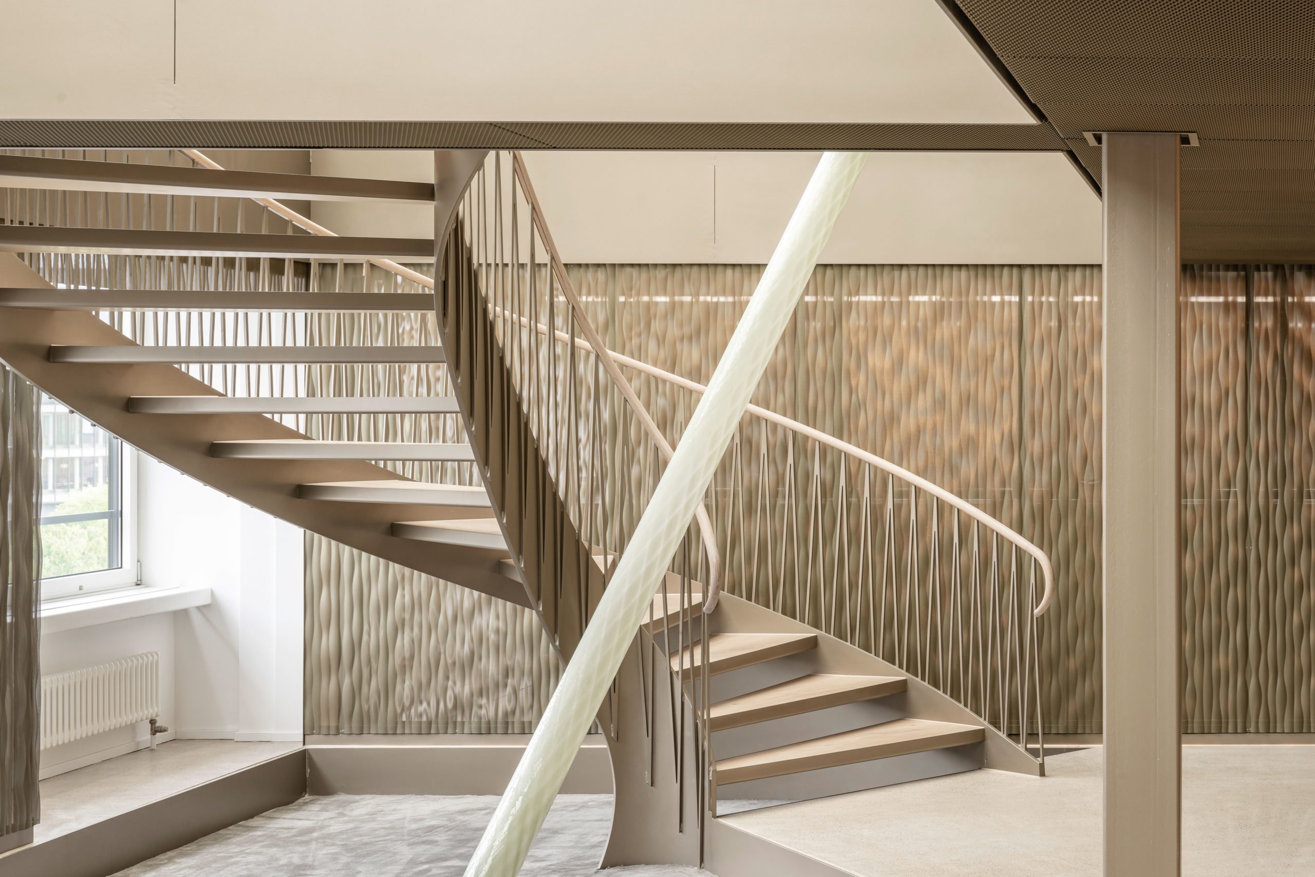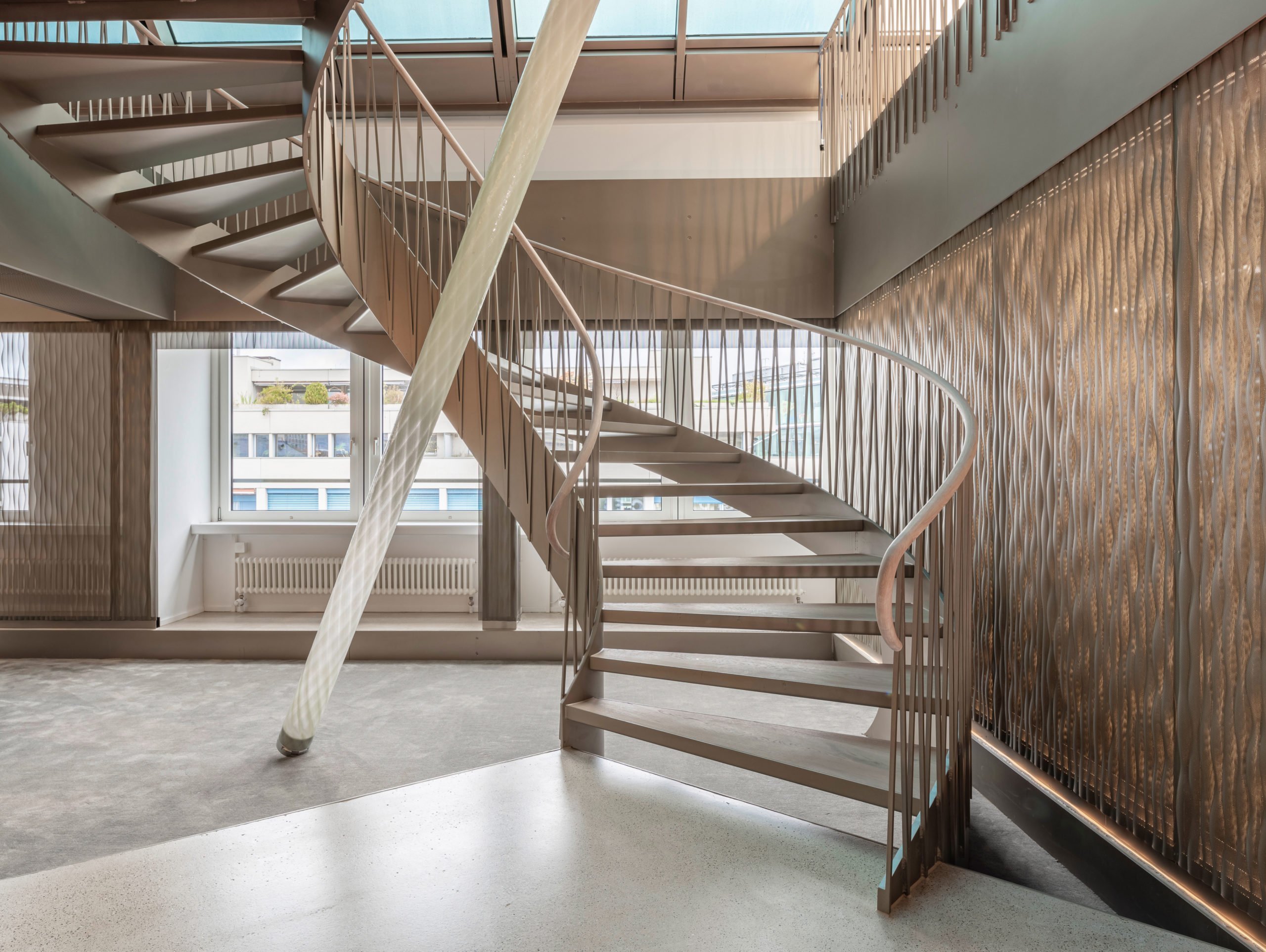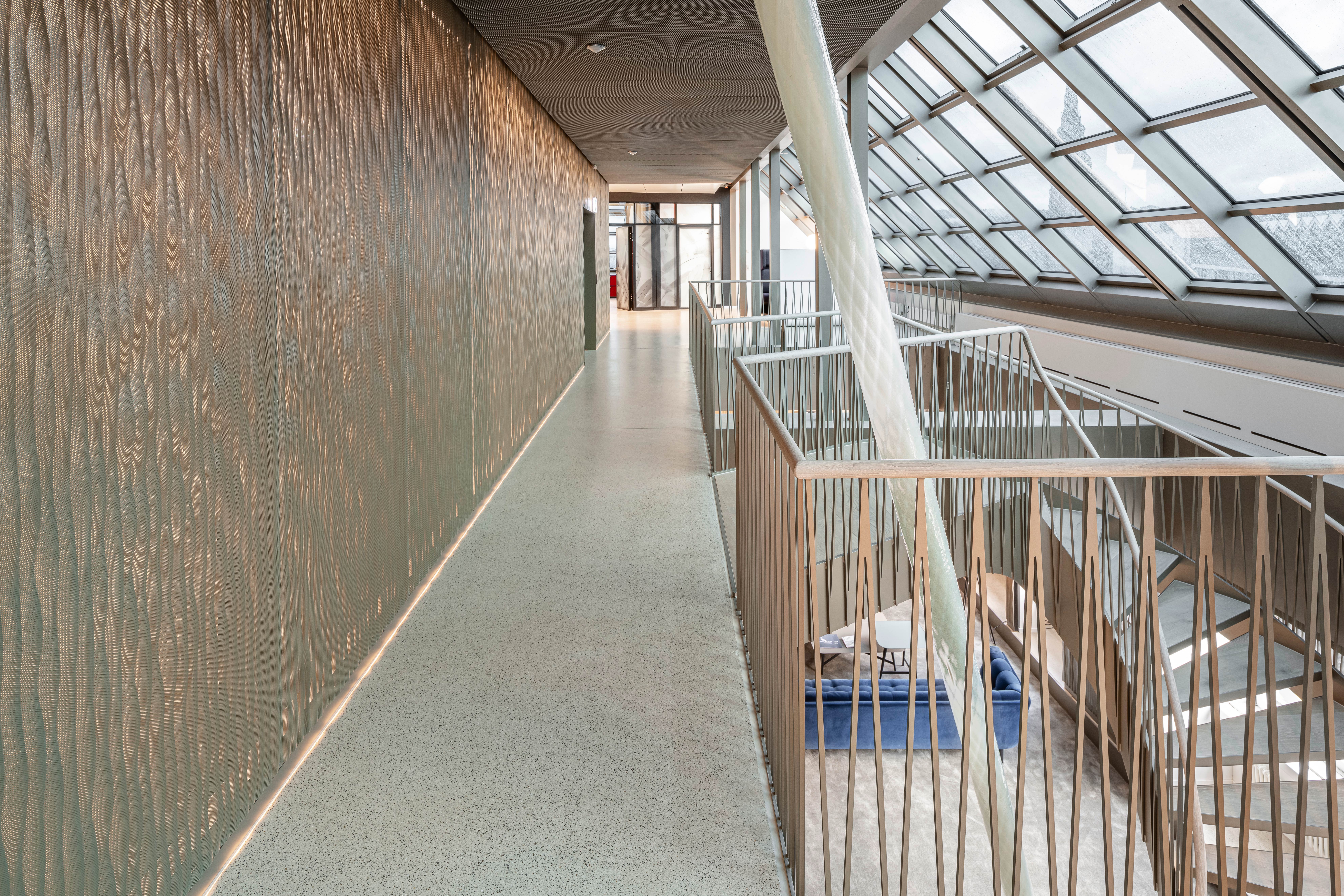 Im Innenausbau und in der Ausstattung hat das Architekturbüro mépp bewusst und gezielt wertige und industrielle Materialien kombiniert. Harmonische Erdfarben sowie mineralische Nuancen verschmelzen mit metallischen Beigetönen. Transparenz, Transluzenz und Reflektion sorgen für spannende Lichtspiele und eine überraschende Raumwahrnehmung. Bei dem eingesetzten Produkt handelt es sich um die Wasserwelle XL in pulverbeschichtetem Stahl. Die versetzt rundgelochten Platten werden rückseitig beleuchtet und schaffen somit eine ideale Lichtstimmung in den Büroräumen.