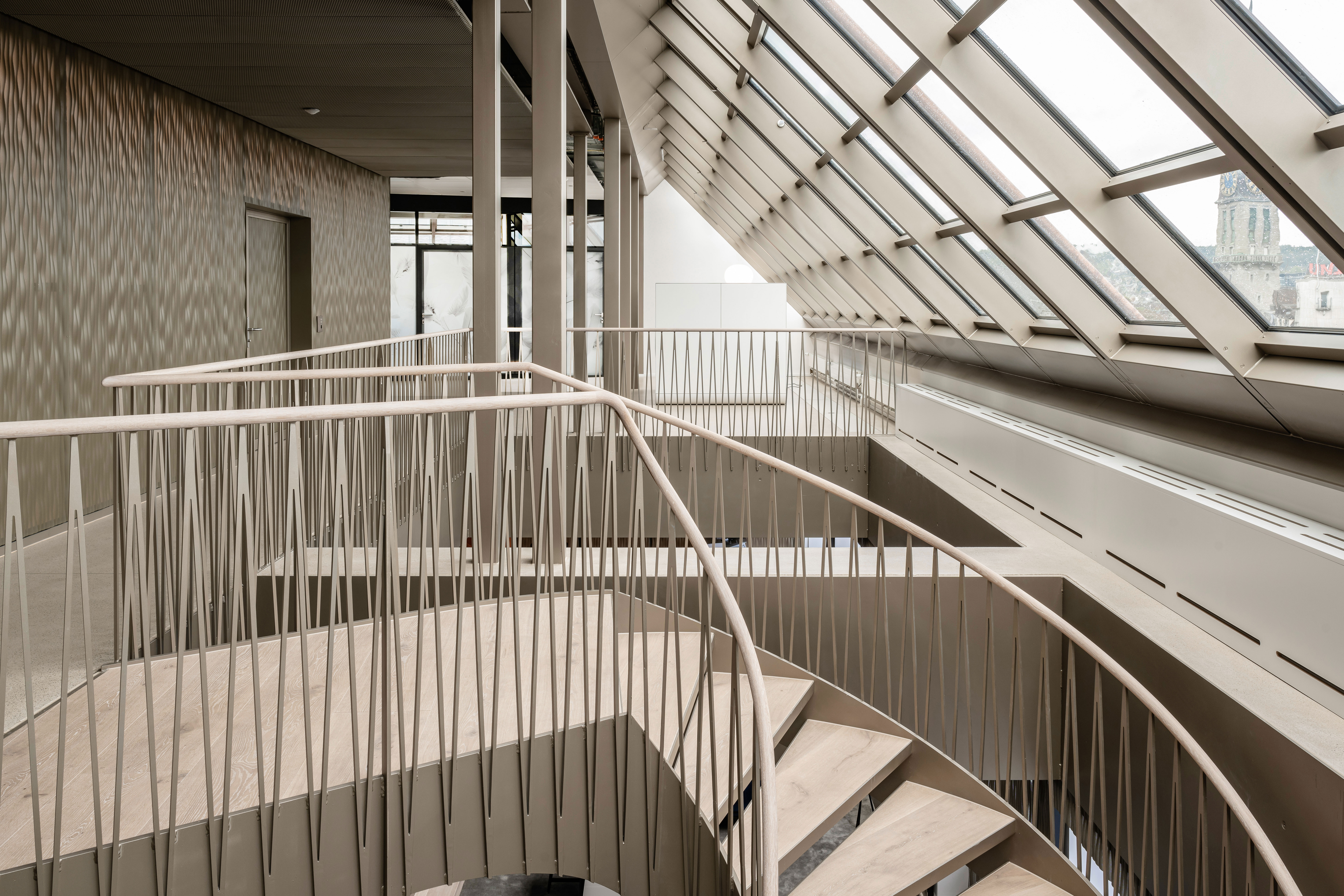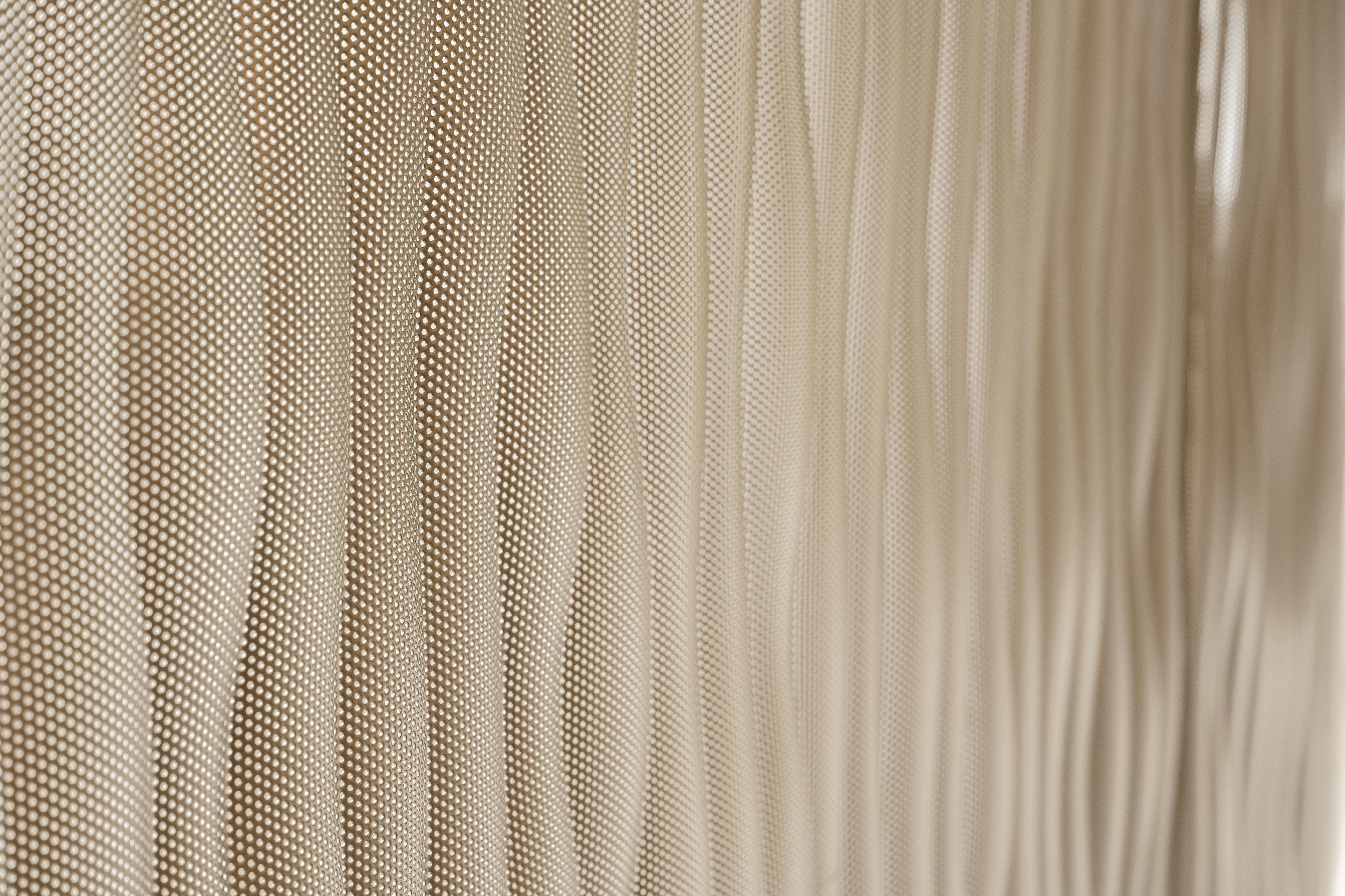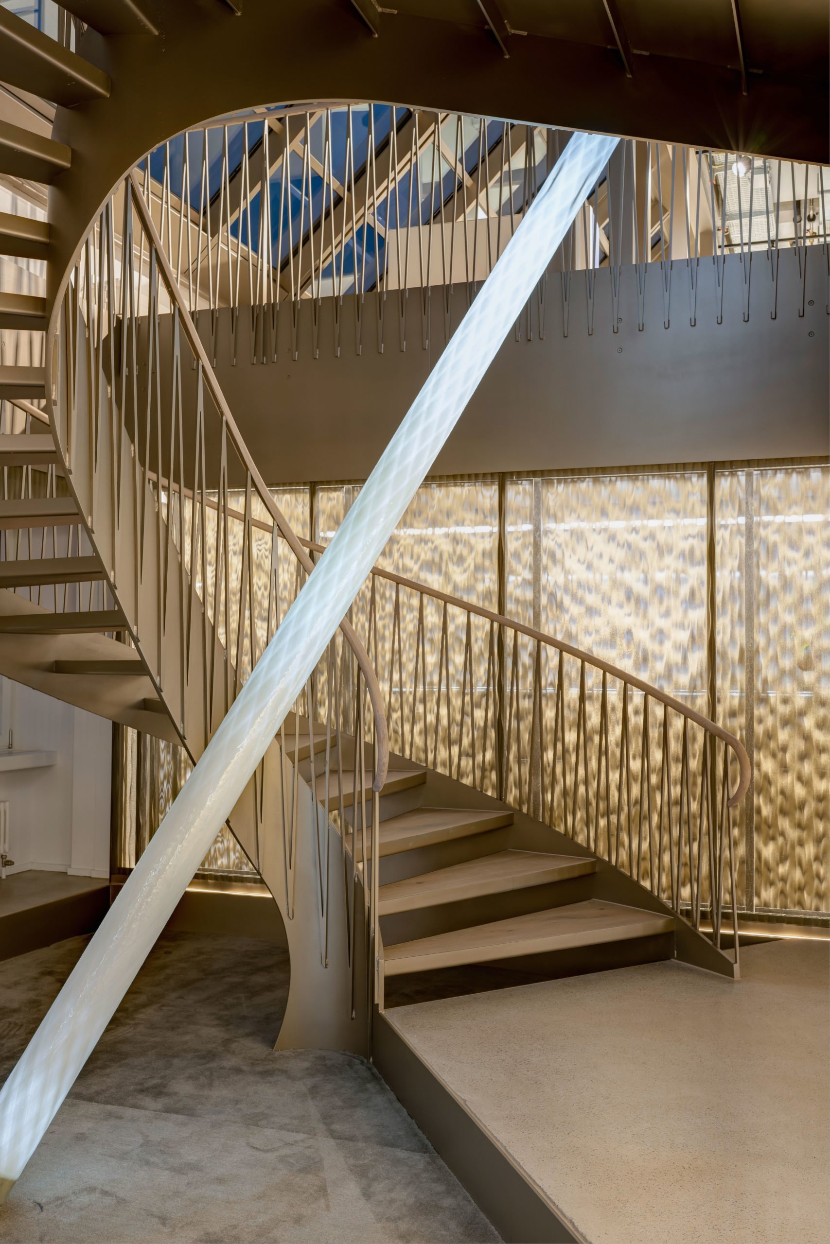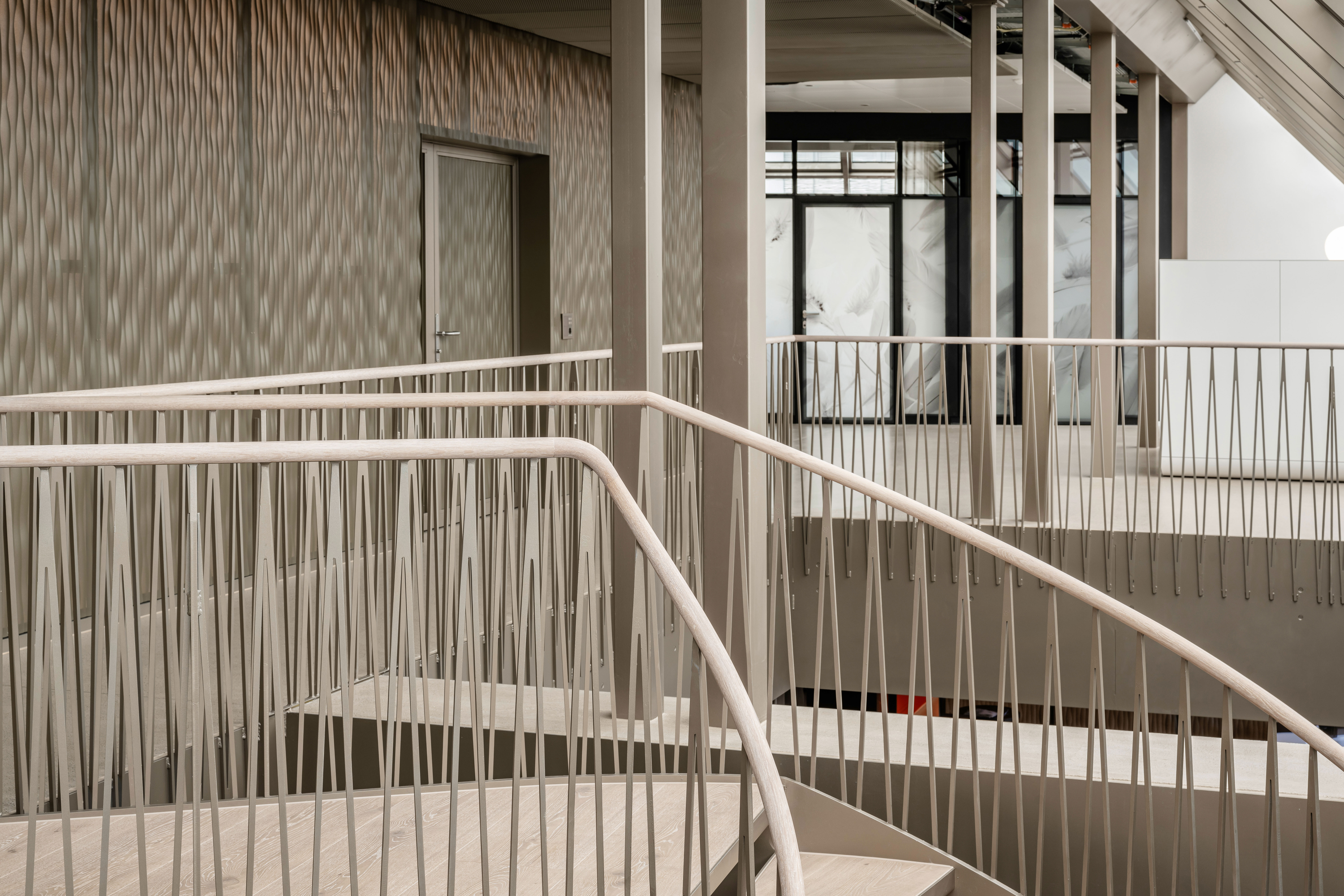Im Innenausbau und in der Ausstattung hat das Architekturbüro mépp bewusst und gezielt wertige und industrielle Materialien kombiniert. Harmonische Erdfarben sowie mineralische Nuancen verschmelzen mit metallischen Beigetönen. Transparenz, Transluzenz und Reflektion sorgen für spannende Lichtspiele und eine überraschende Raumwahrnehmung. Bei dem eingesetzten Produkt handelt es sich um die Wasserwelle XL in pulverbeschichtetem Stahl. Die versetzt rundgelochten Platten werden rückseitig beleuchtet und schaffen somit eine ideale Lichtstimmung in den Büroräumen.