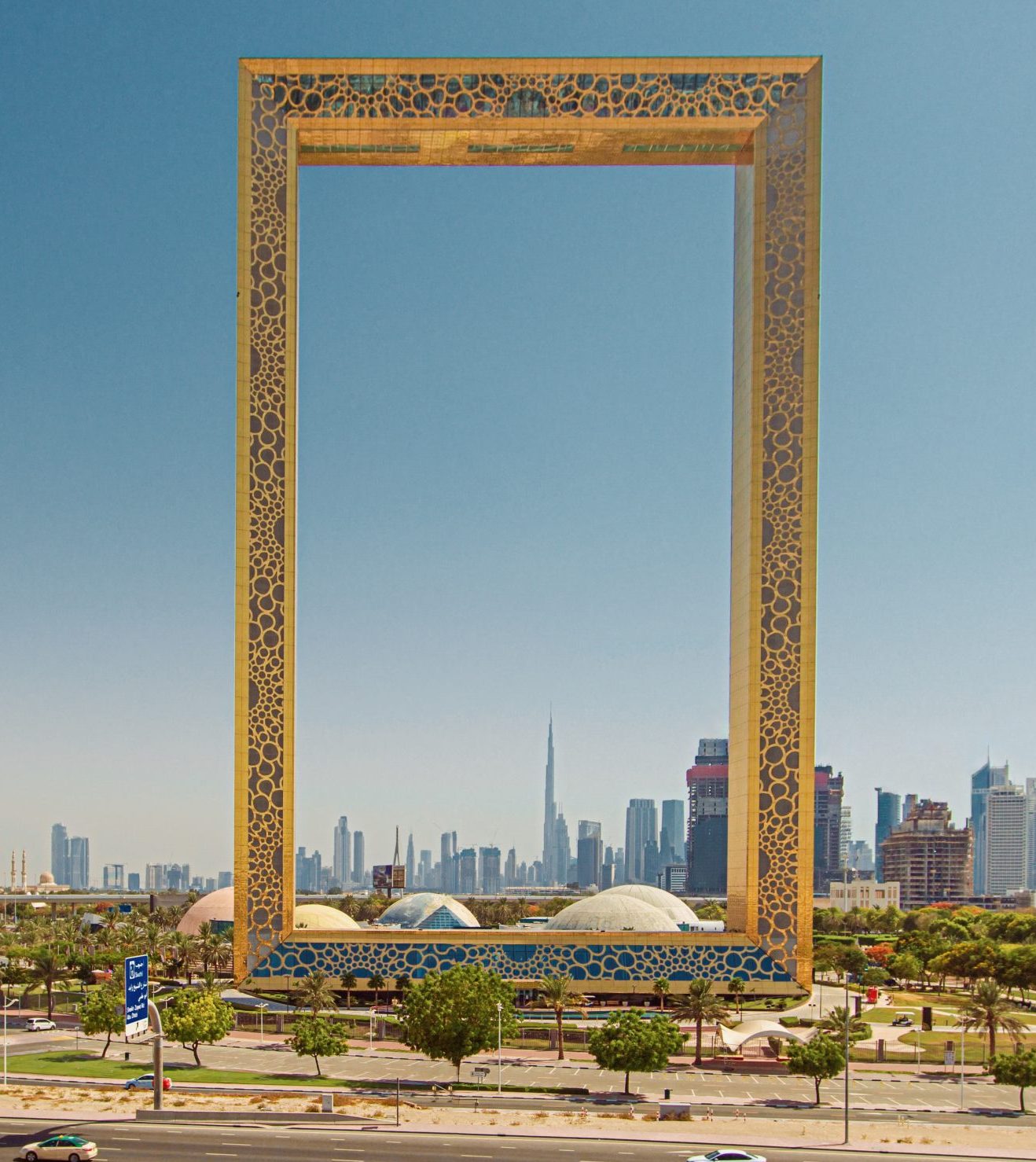 Fielitz 3D Platte Spezialanfertigung Edelstahl PVD Tin Gold Aerial view of Dubai Frame Downtown skyline United Arab Emirates or UAE Financial district and business area in smart urban city Skyscraper and high rise buildings at sunset