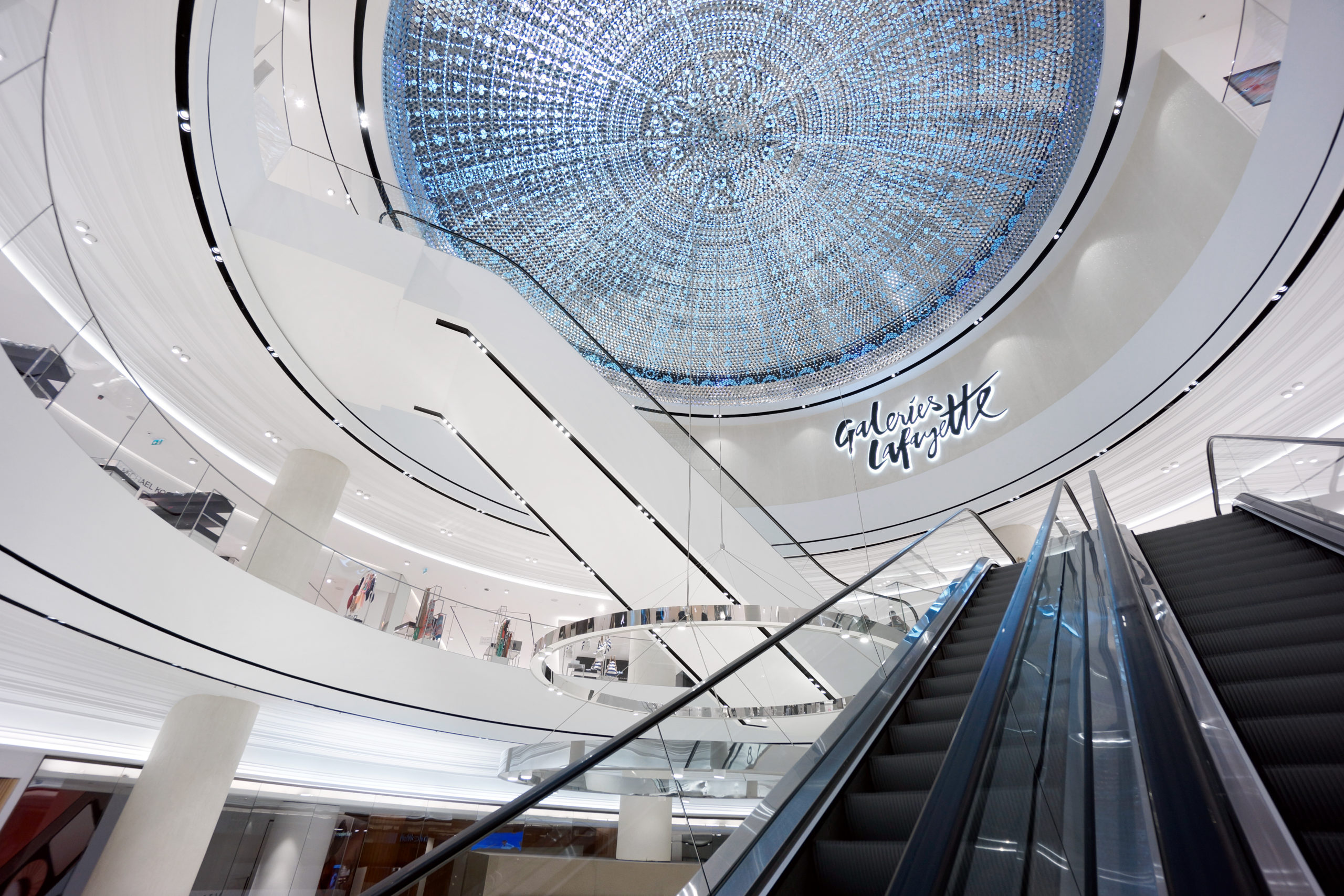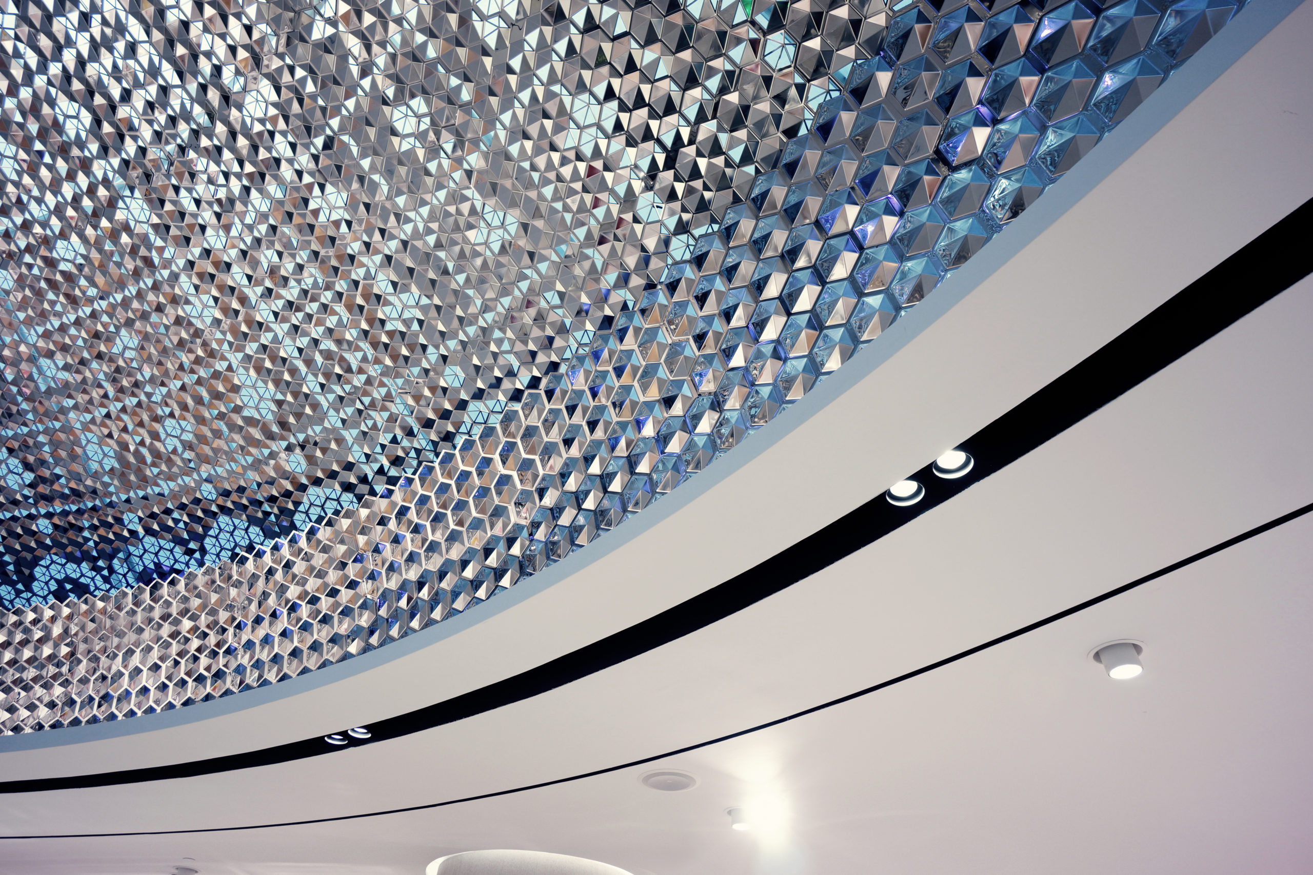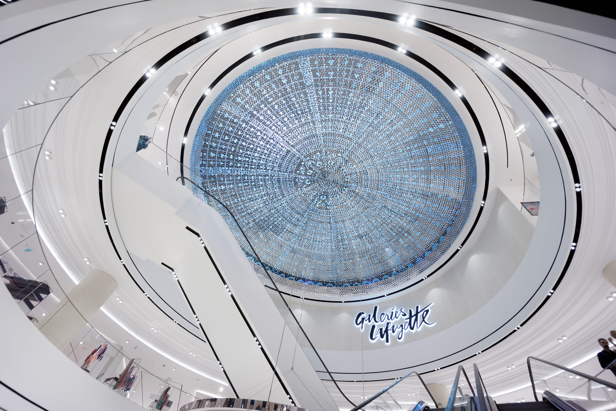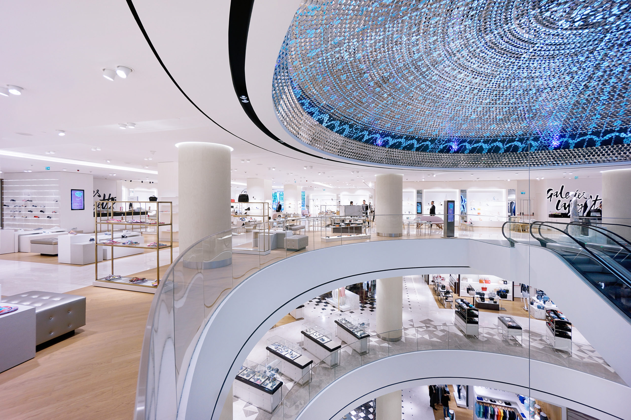 Highlight of the design concept is a 20 meter wide atrium. Situated above, plajer & franz studio designed an extraordinary cupola, made of polished steel prisms, which had been pressed with a pressure of 80 tons. Patterned with a new laser-cut technique, the so called “coupole” is an artistic interpretation of the famous cupola at the retailers’ headquarters in Paris.