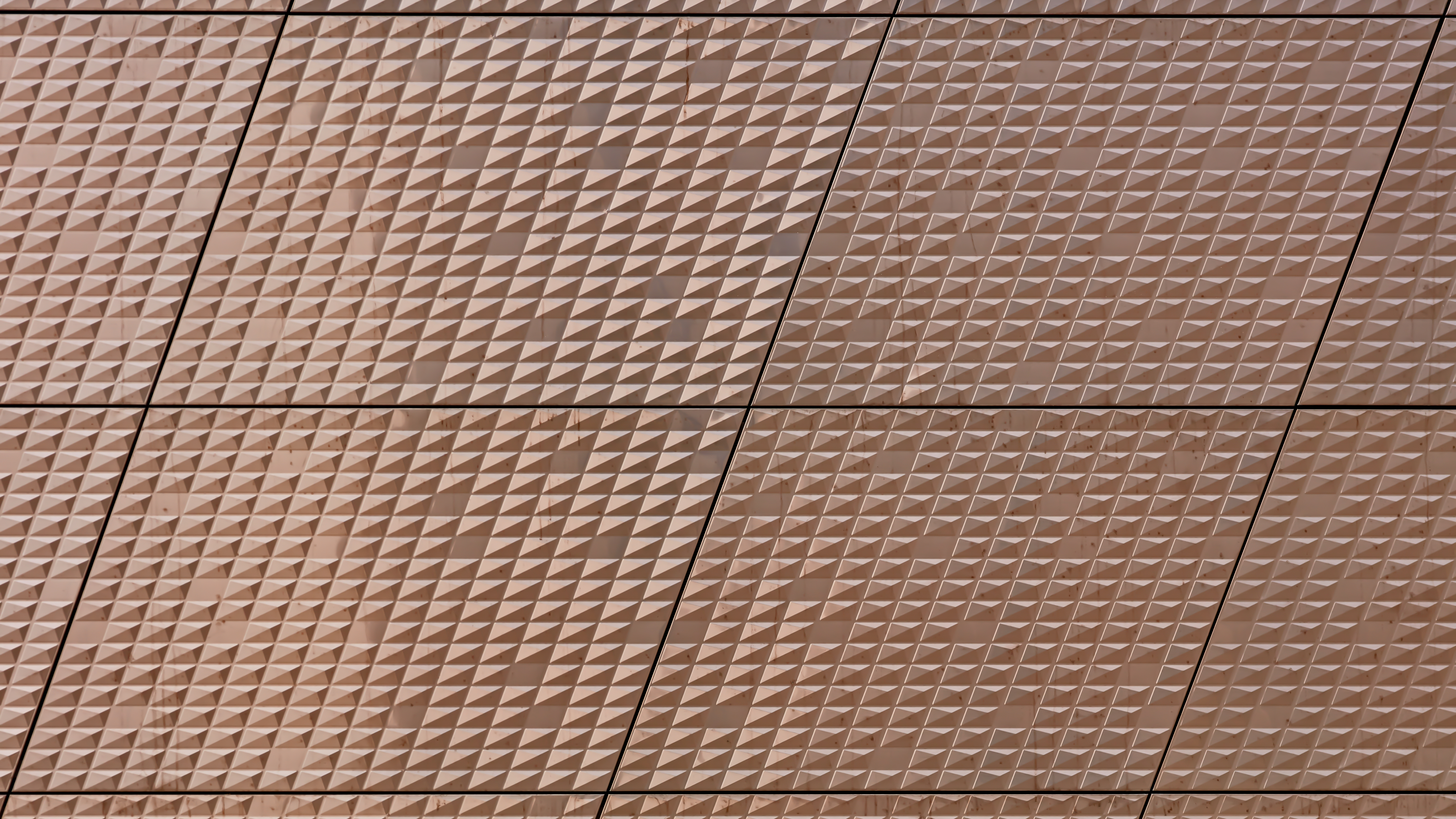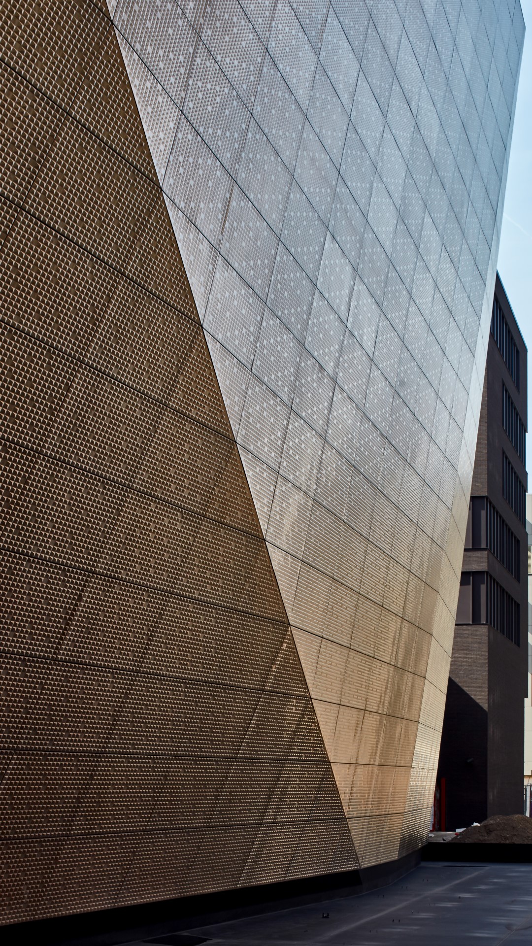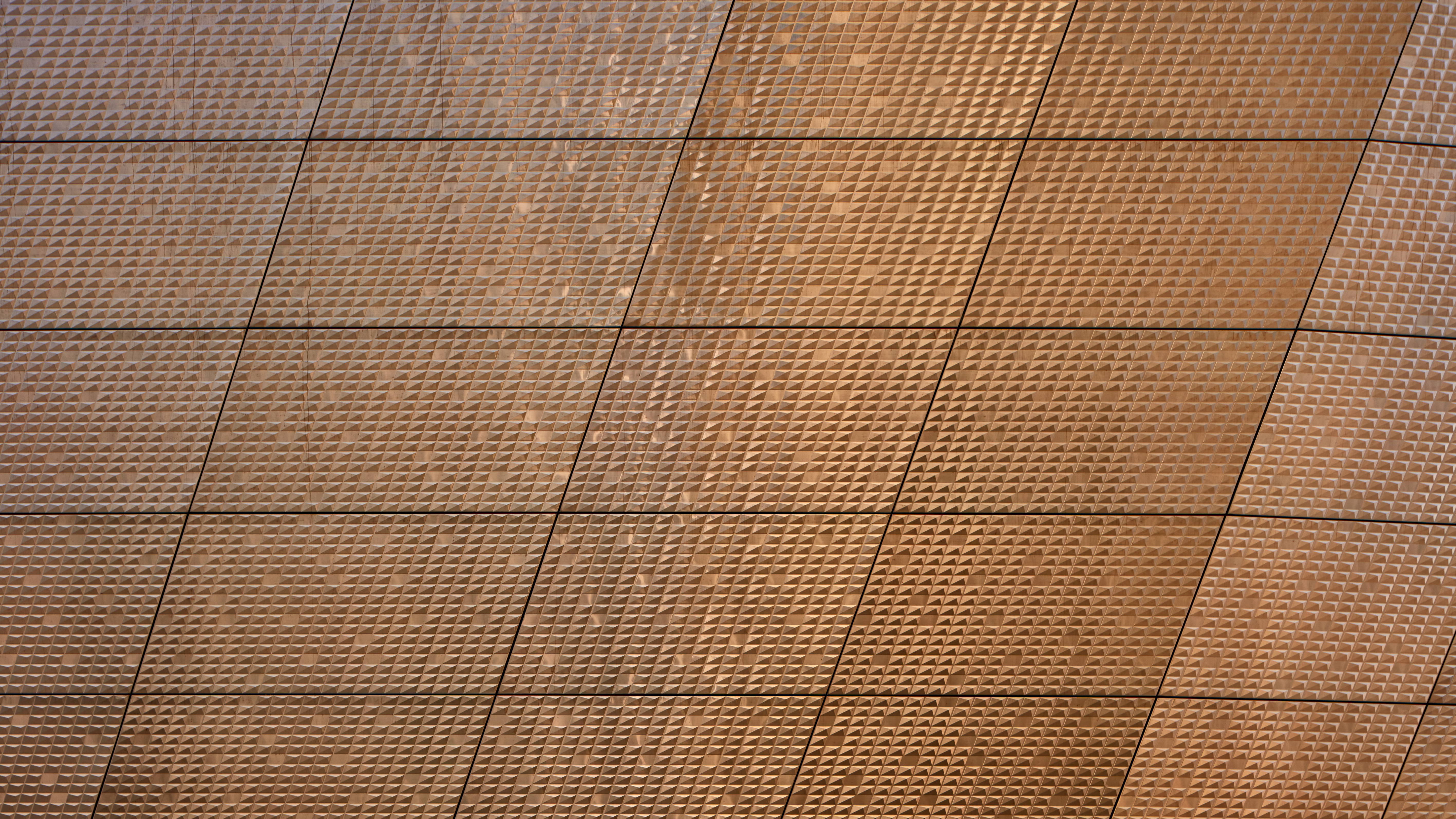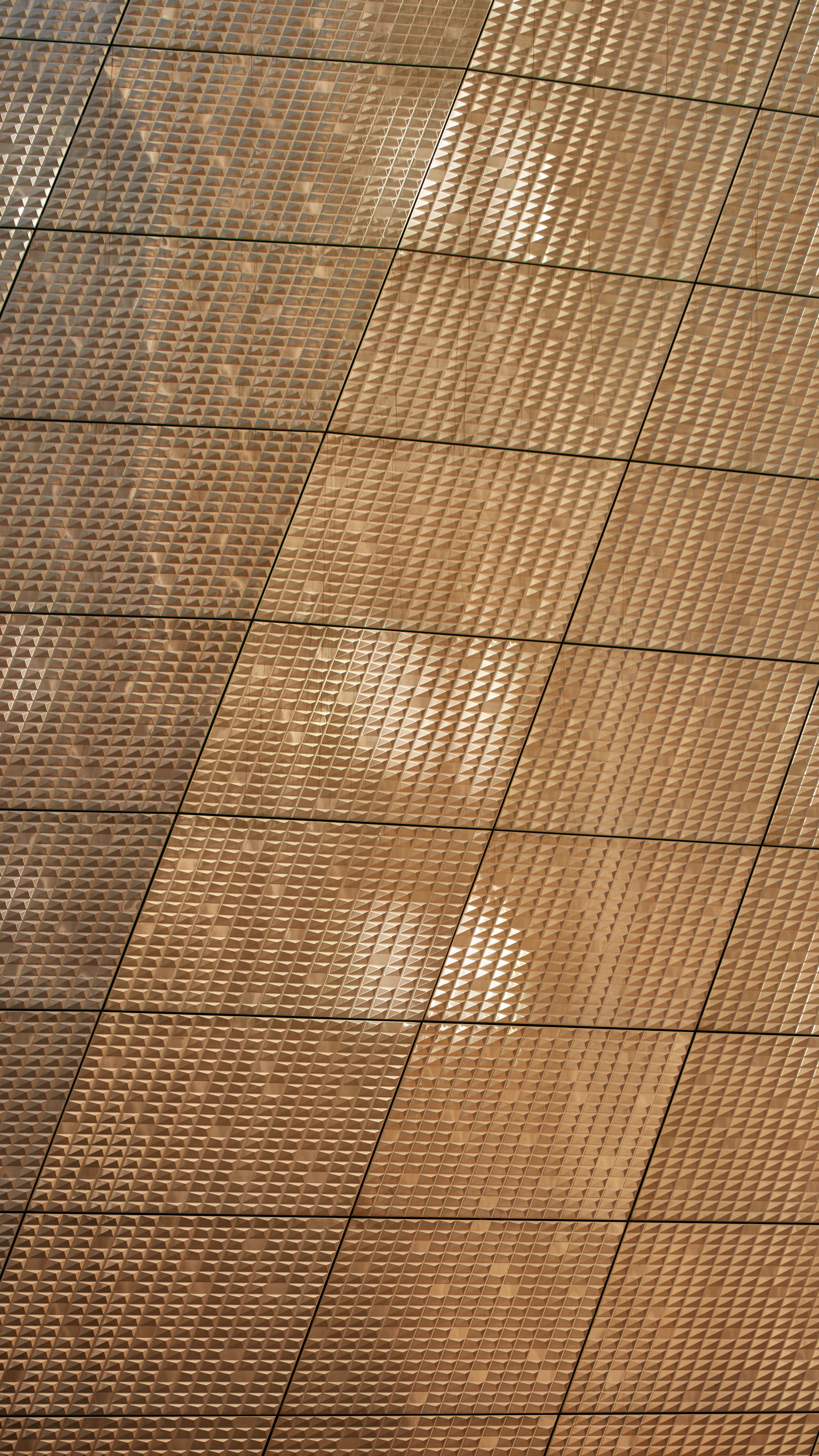 Die Fassadengestaltung von Atelier d’Architecture & de Design Jim Clemes basiert auf einem rautenförmigen Kristall. Die einzelnen Fassadenelemente sind trapezförmig zugeschnitten und vierseitig gekantet mit einer schmalen Fuge montiert. Innerhalb der einzelnen Platten sind die Kristalle nach vorgegebenem Design angordnet und partiell als plane Flächen ausgelassen. Durch die besondere Oberfläche der Edelstahlelemente – PVD bronze beschichtet und mit einem Hairlineschliff versehen – verändert sich die Farbigkeit des Kubus je nach Tageszeit und Sonneneinstrahlung.