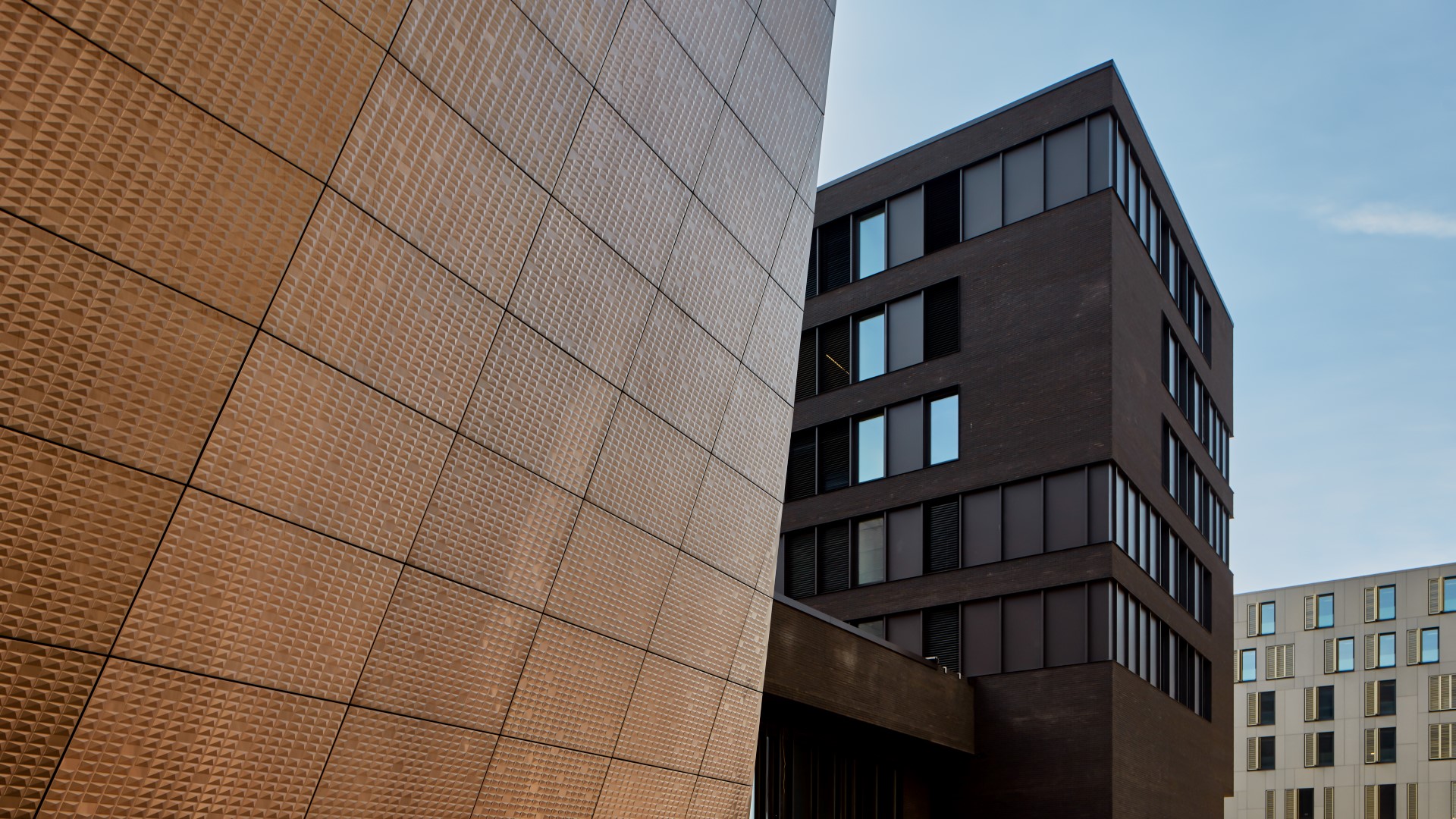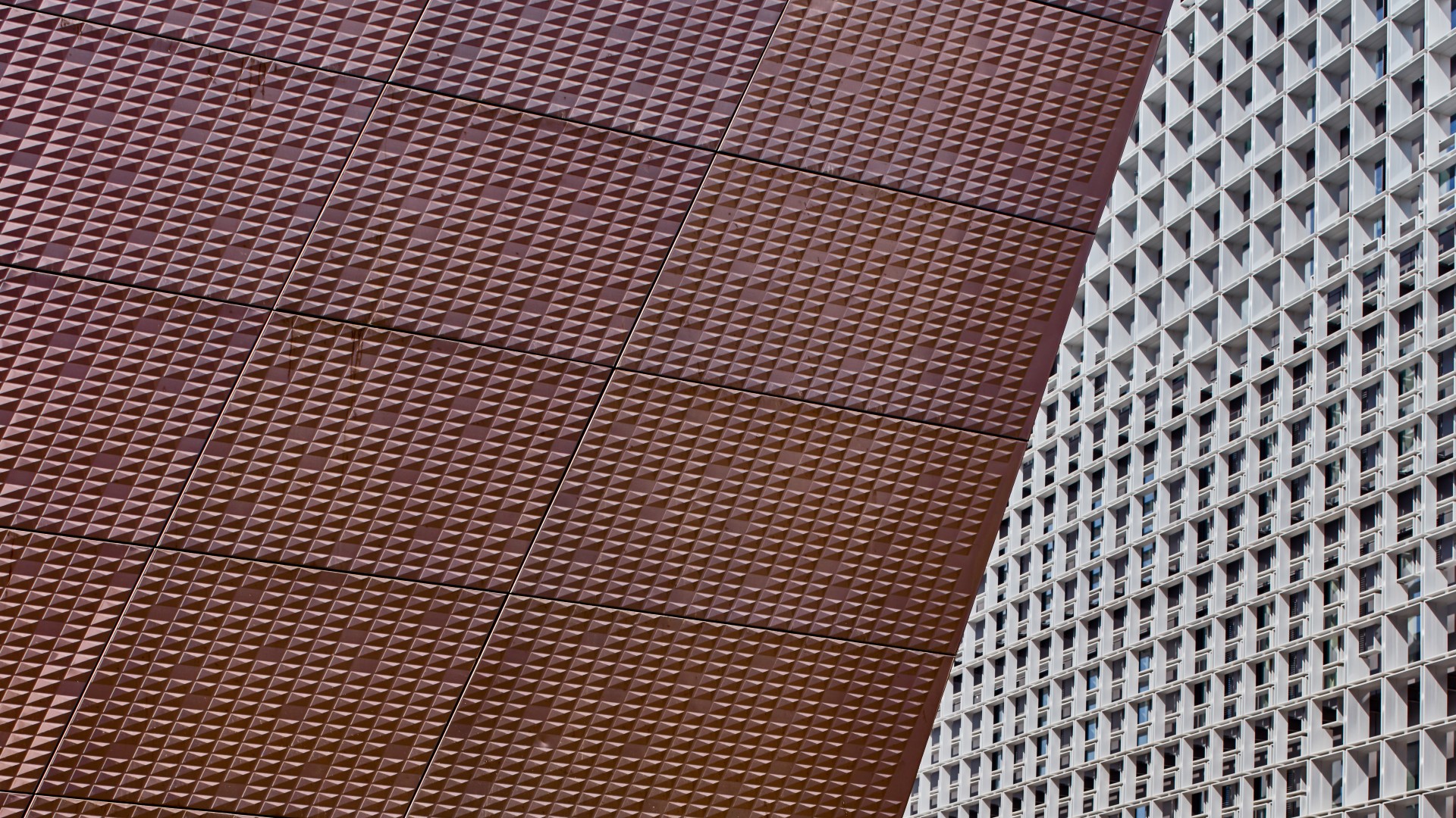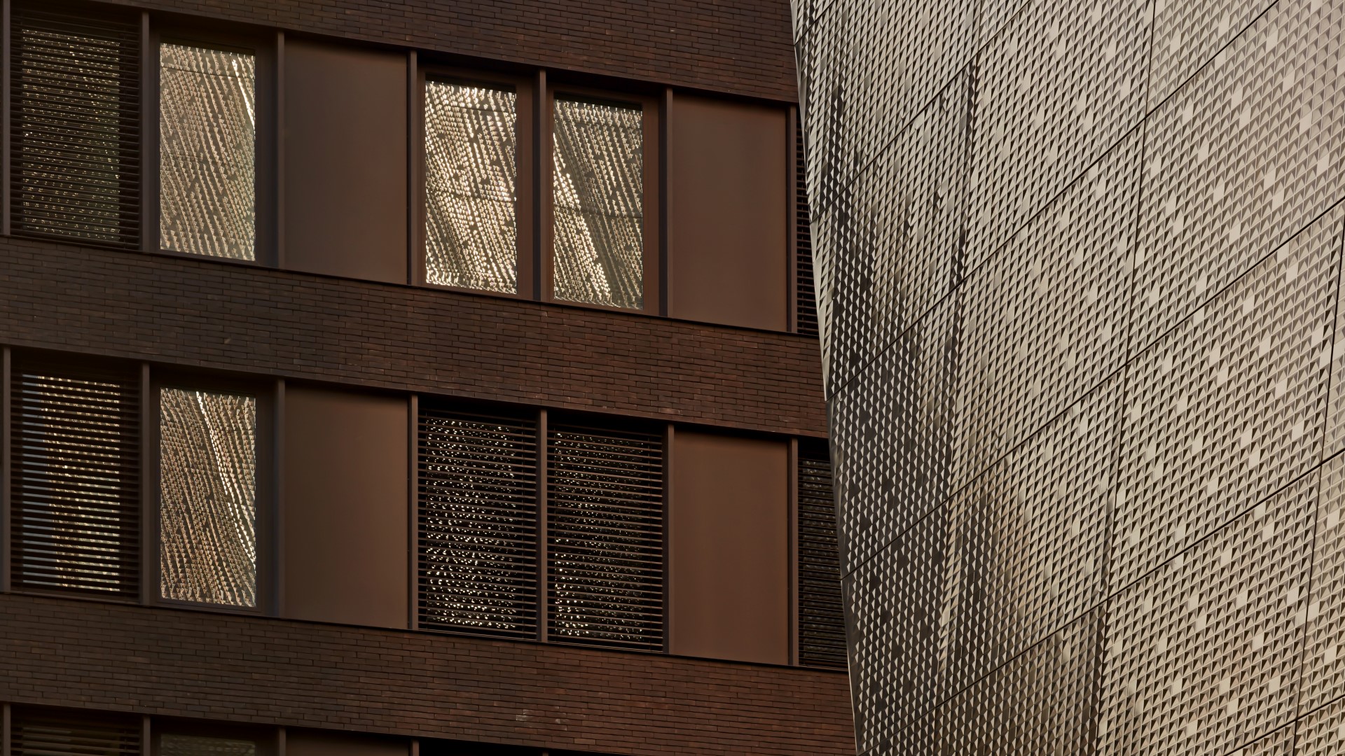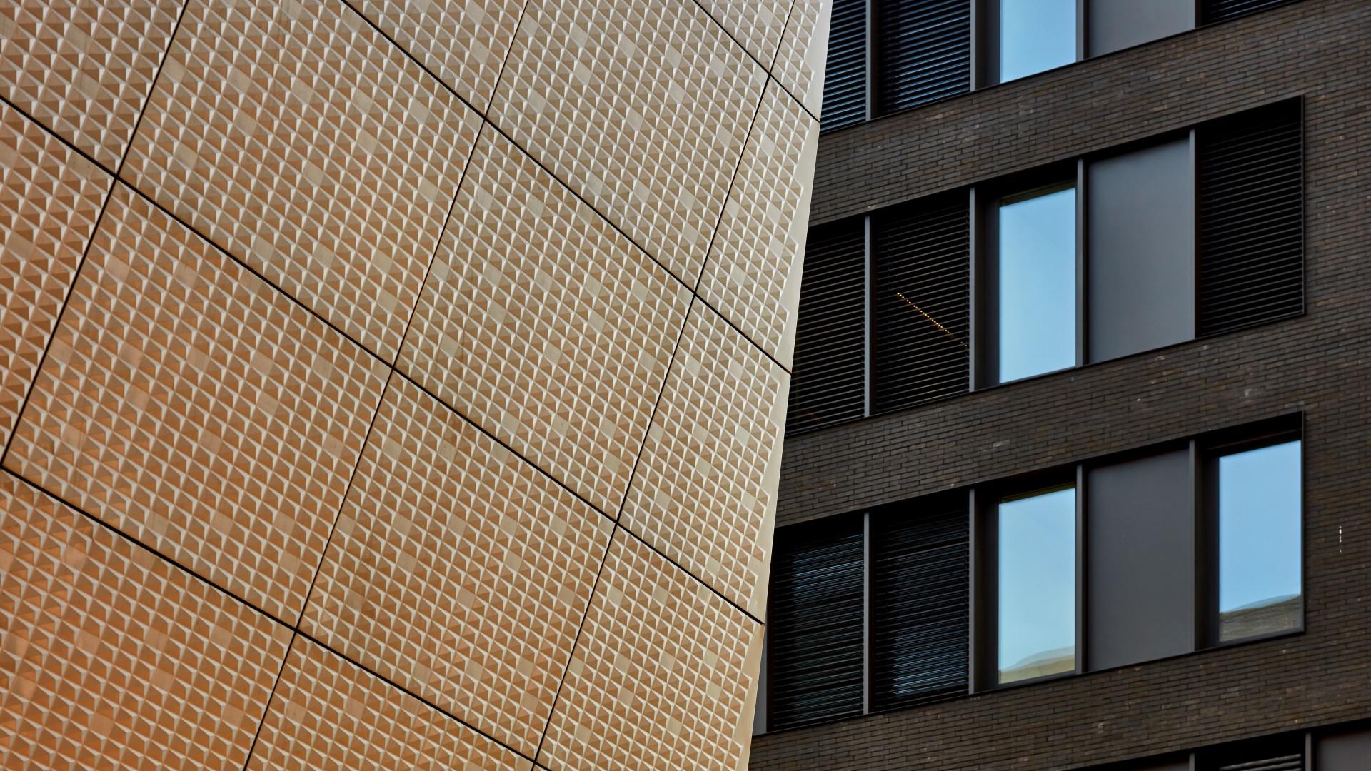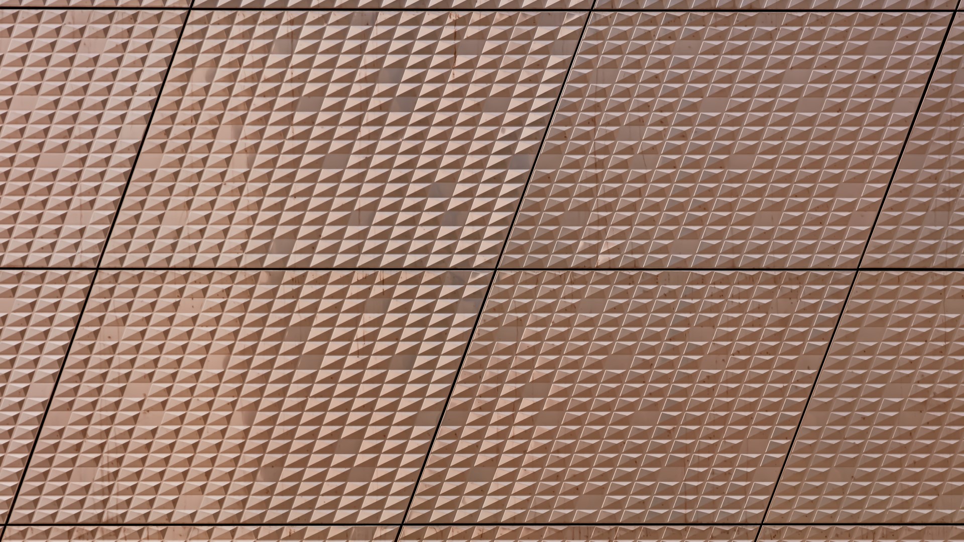 Die Fassadengestaltung von Atelier d’Architecture & de Design Jim Clemes basiert auf einem rautenförmigen Kristall. Die einzelnen Fassadenelemente sind trapezförmig zugeschnitten und vierseitig gekantet mit einer schmalen Fuge montiert. Innerhalb der einzelnen Platten sind die Kristalle nach vorgegebenem Design angordnet und partiell als plane Flächen ausgelassen. Durch die besondere Oberfläche der Edelstahlelemente – PVD bronze beschichtet und mit einem Hairlineschliff versehen – verändert sich die Farbigkeit des Kubus je nach Tageszeit und Sonneneinstrahlung.