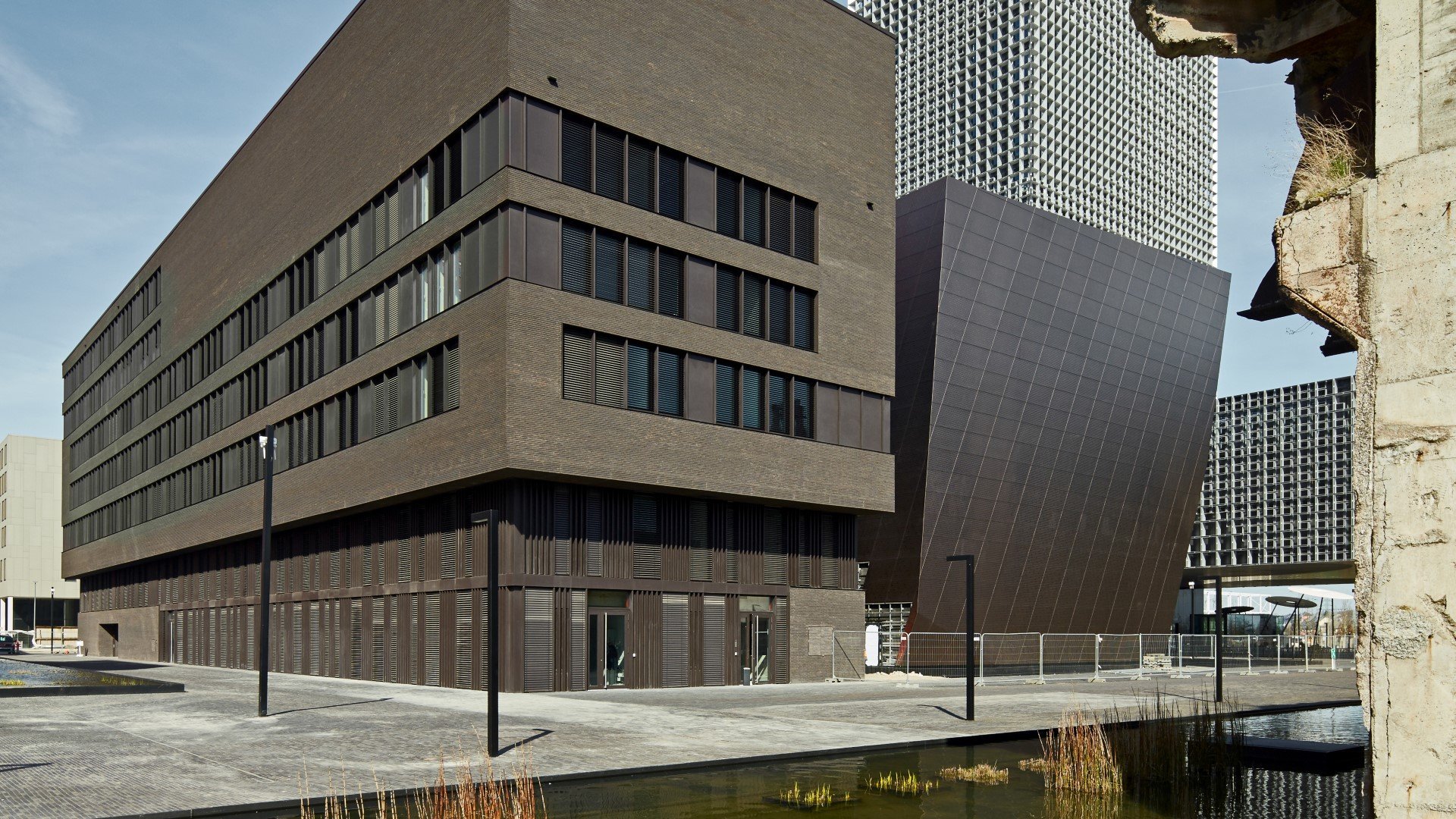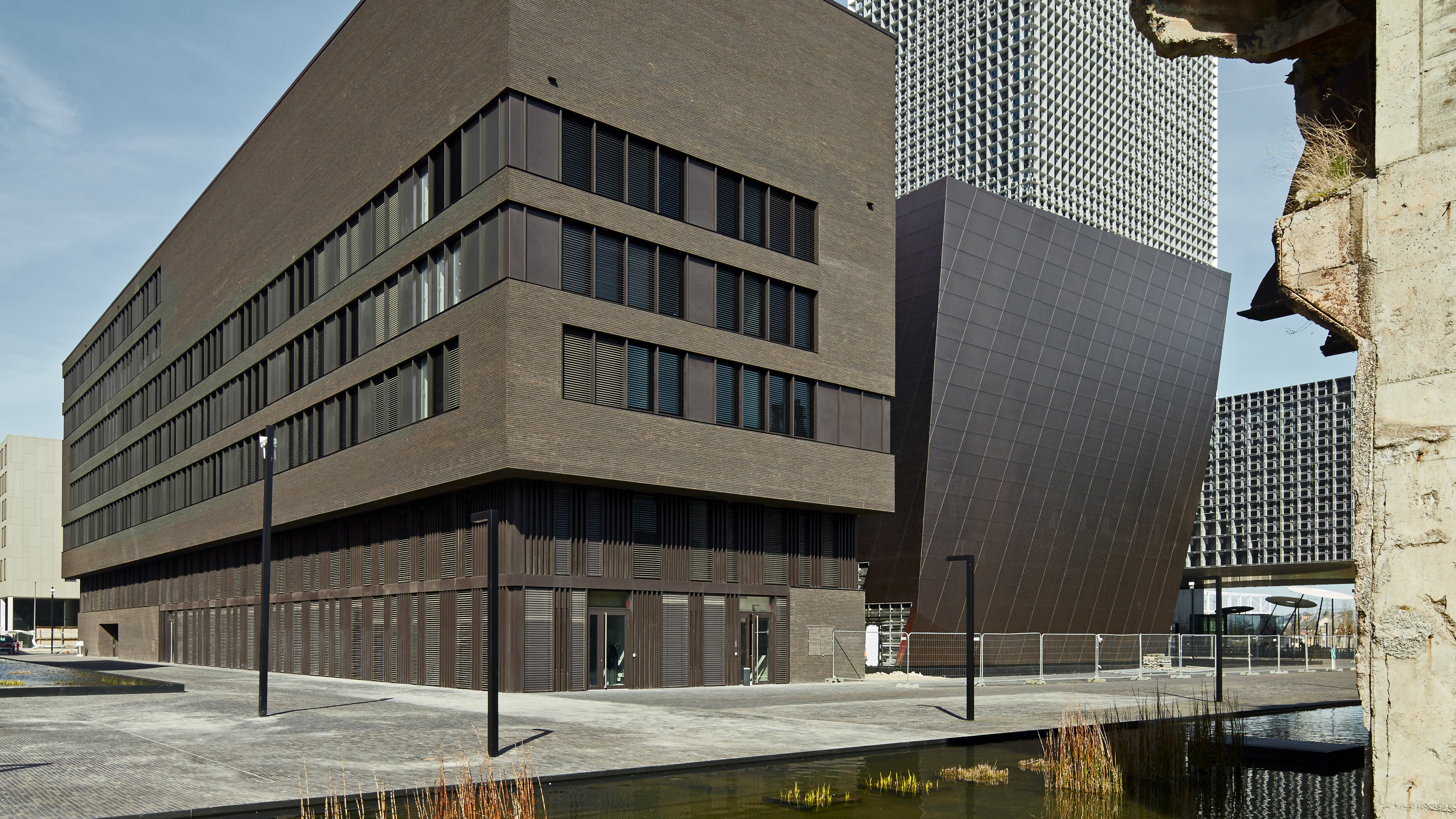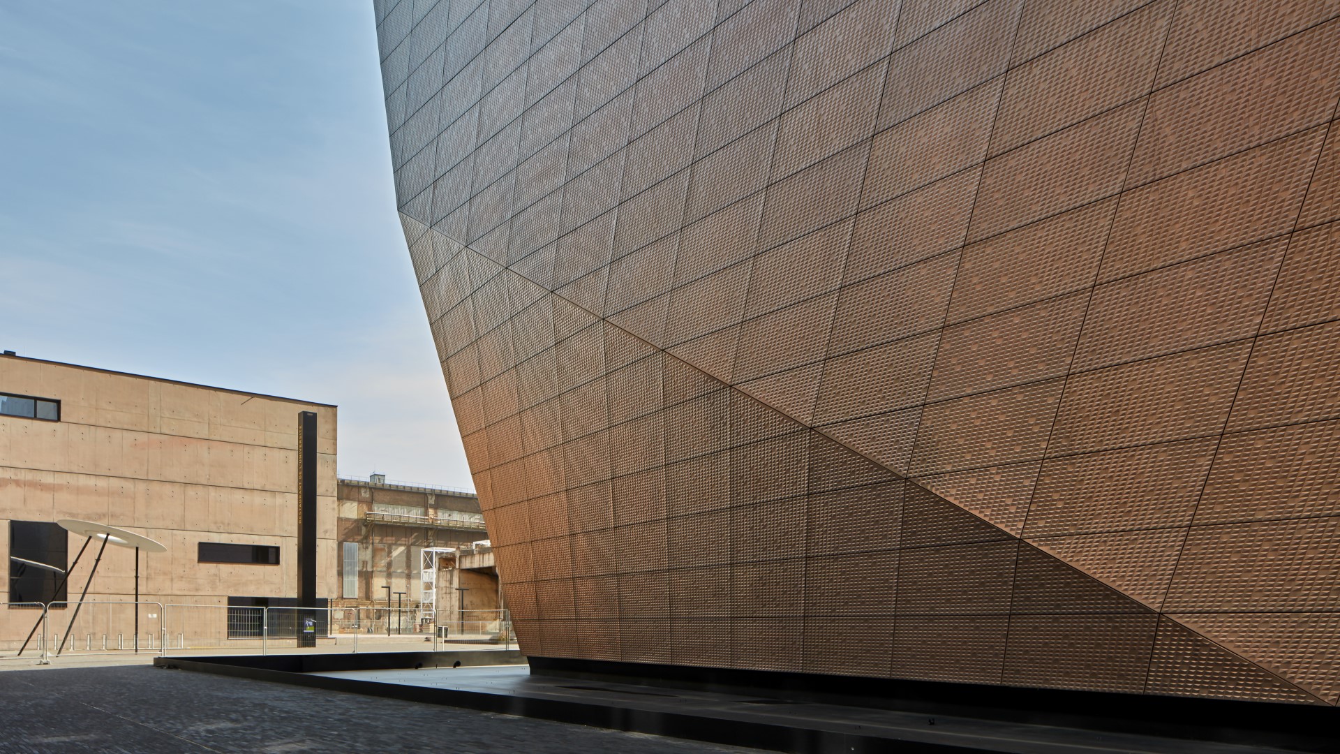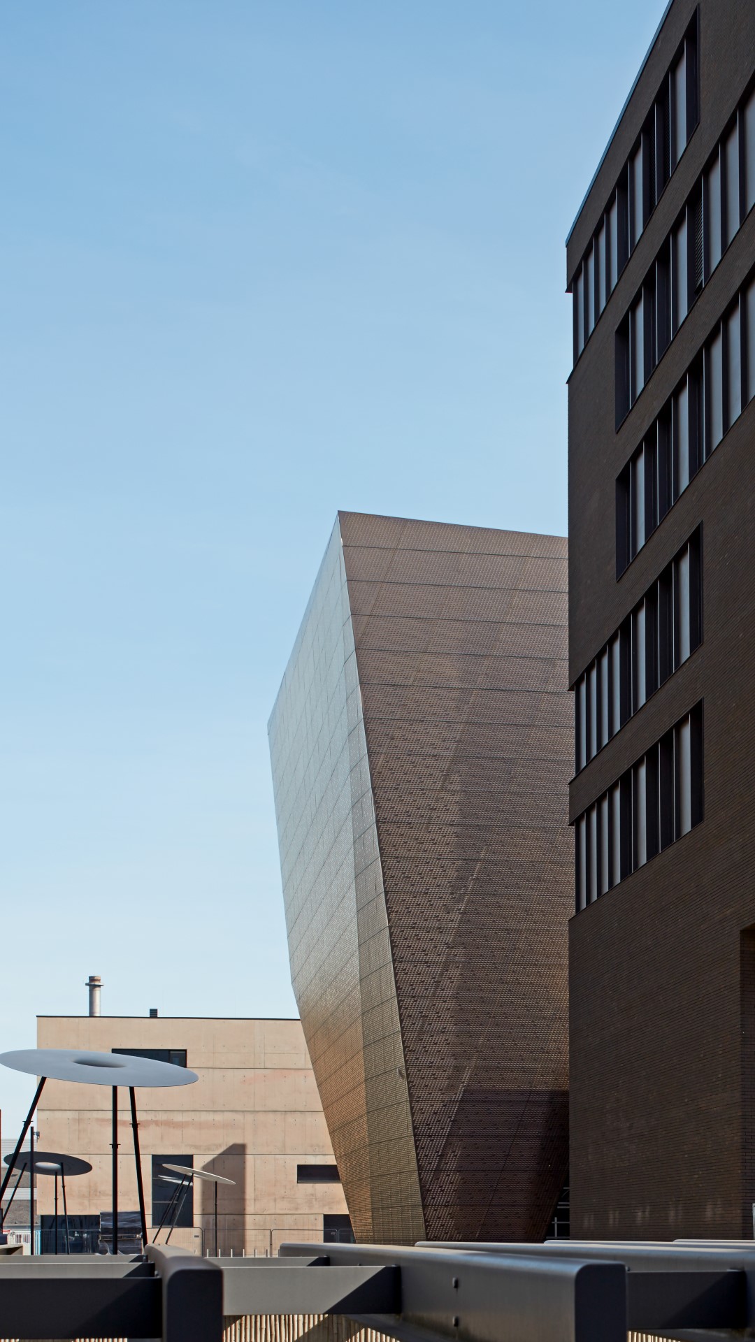 Die Fassadengestaltung von Atelier d’Architecture & de Design Jim Clemes basiert auf einem rautenförmigen Kristall. Die einzelnen Fassadenelemente sind trapezförmig zugeschnitten und vierseitig gekantet mit einer schmalen Fuge montiert. Innerhalb der einzelnen Platten sind die Kristalle nach vorgegebenem Design angordnet und partiell als plane Flächen ausgelassen. Durch die besondere Oberfläche der Edelstahlelemente – PVD bronze beschichtet und mit einem Hairlineschliff versehen – verändert sich die Farbigkeit des Kubus je nach Tageszeit und Sonneneinstrahlung.