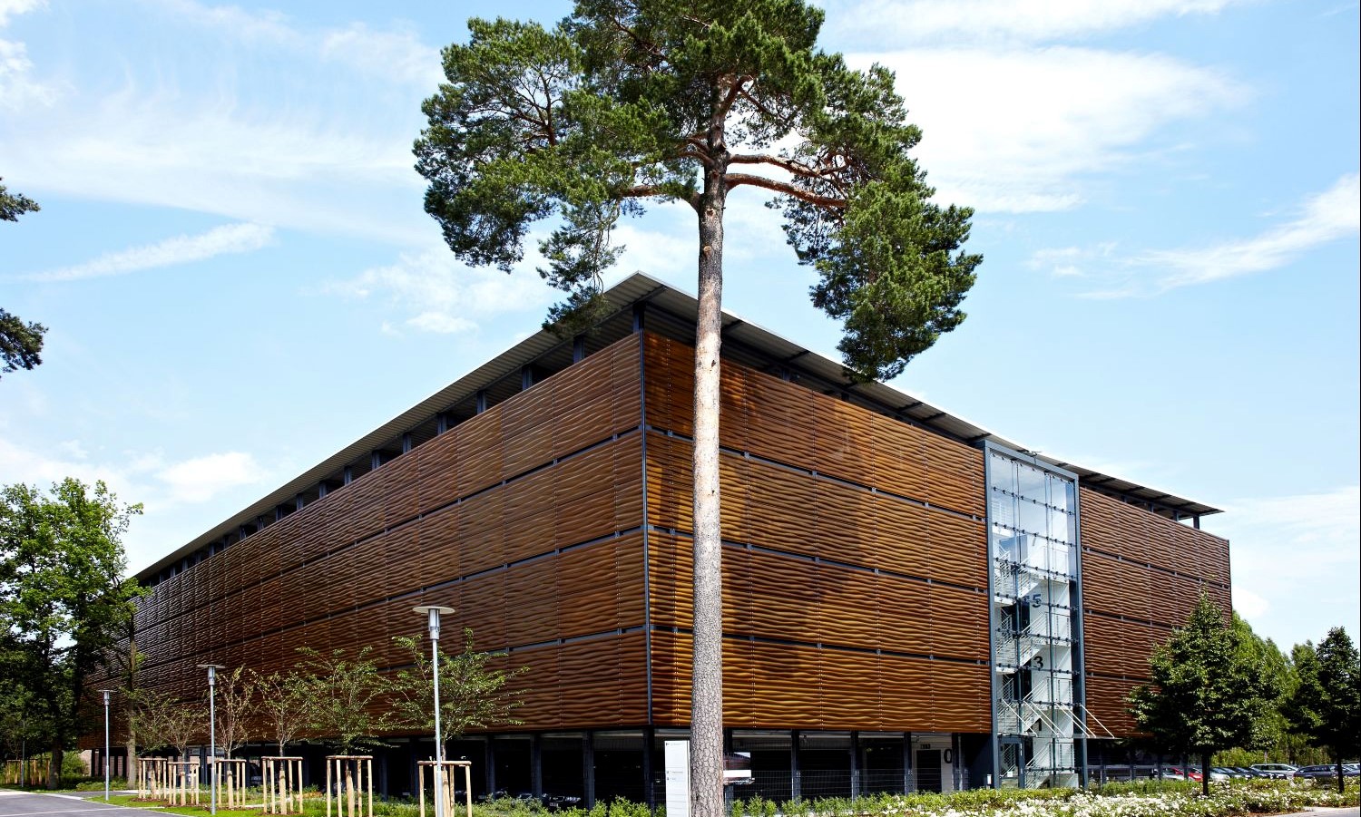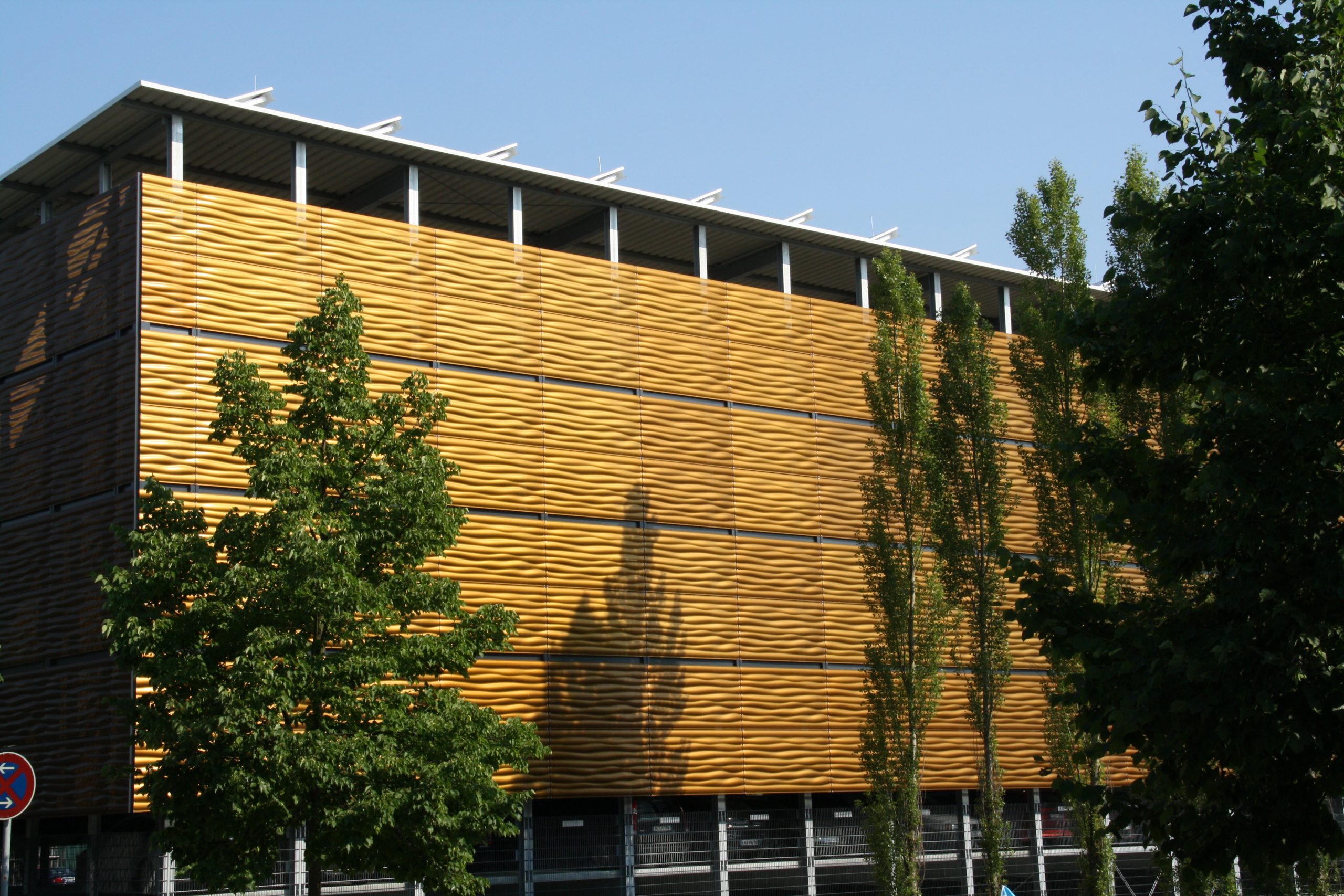 In Zusammenarbeit mit JGT-Architekten aus Nürnberg entstand eine moderne, vorgehängte 3D-Parkhaus-Fassade, die mittels der 3D-Fluidtechnik außergewöhnlich wettbewerbsfähig realisiert werden konnte. Die Wahl des Lochbildes ermöglicht optimale Voraussetzung für Transluzenz, Sonnenschutz, Blendschutz und Lüftung. Die 3D Platten „Wasserwelle Vision“, deren Wellengeometrie über die Plattenstöße hinaus fortgeführt wird, umhüllen das Gebäude als fließende Fassadenelemente. Die 3D-Struktur der 3,5 Quadratmeter großen Elemente, versteift die gelochten Aluminiumtafeln so stark, dass die Unterkonstruktion auf ein Minimum reduziert wird. Die 3D Platten wurden lediglich auf die vertikalen Stützen montiert und können über 2,5 Meter frei spannen, so dass ein lichtdurchfluteter Innenraum ermöglicht wird.
