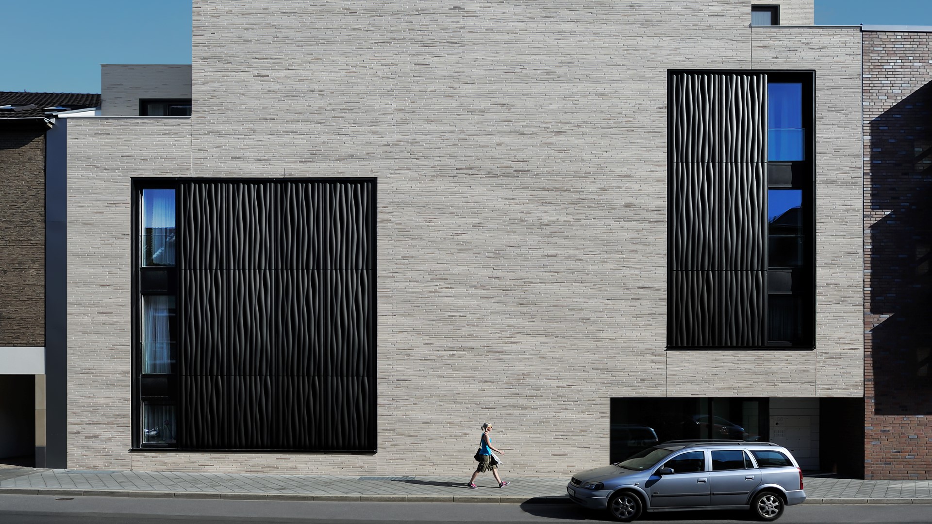 The monolithic impression of the exterior facade which appears almost completely closed is additionally reinforced by two extensive openings: like the inlays made in the building structure, they are covered with three-dimensional anodised plates. These perforated, wave-like oscillating surfaces expose the staircase and living quarters without people on the outside being able to gain a view of the interior.
