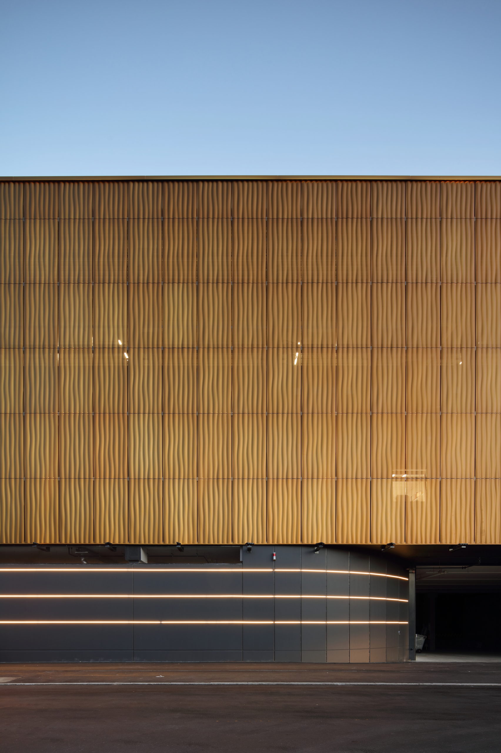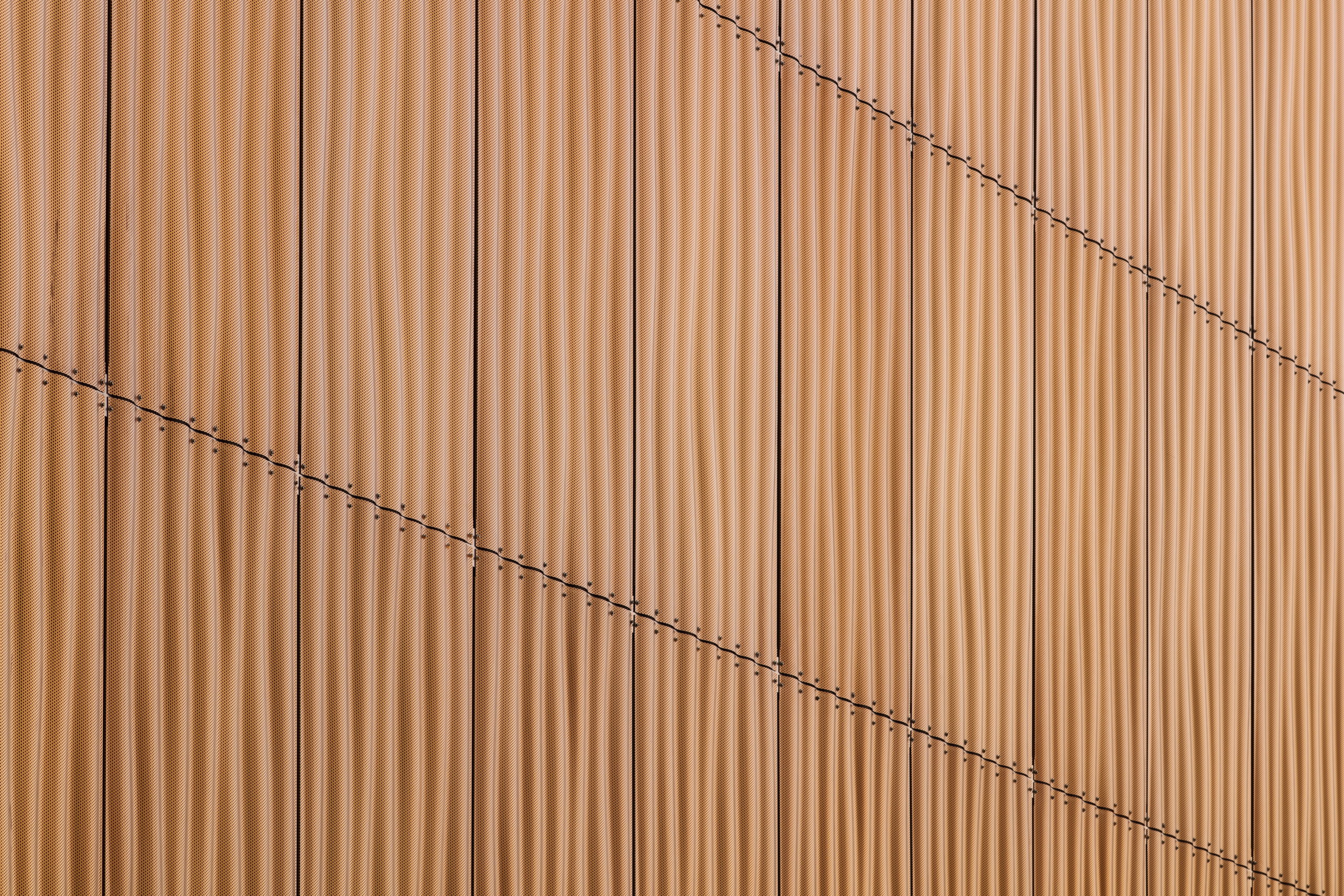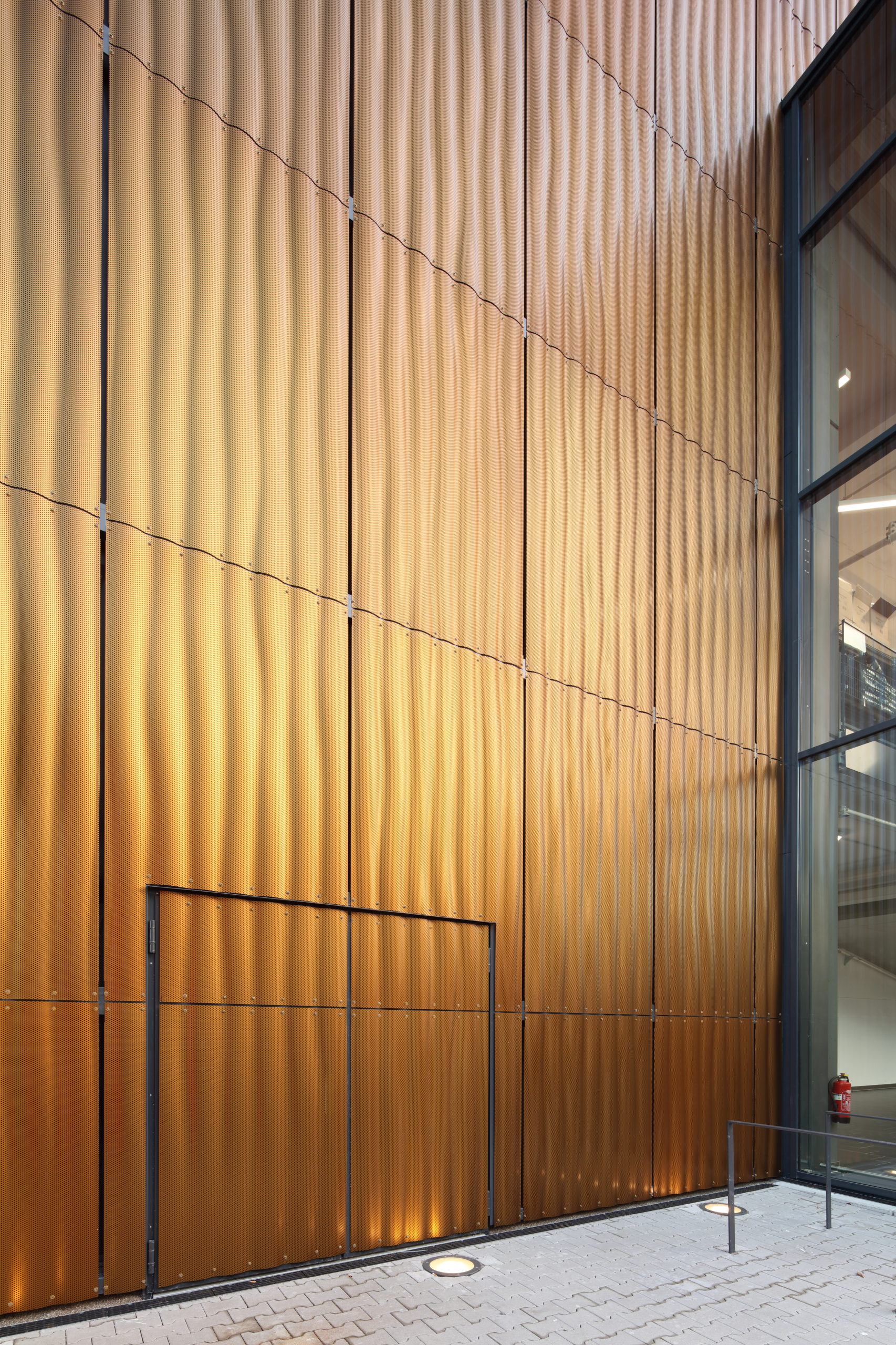 Die 3D Platten Typ „Wasserwelle RH“ mit vertikaler Verlaufsrichtung sind eine Spezialanfertigung nur für dieses Großprojekt. Das gesamte Gebäude wird von einer individuellen, goldenen Welle umhüllt. Die Fassadenpaneele aus Aluminium sind gold eloxiert und gelocht.
