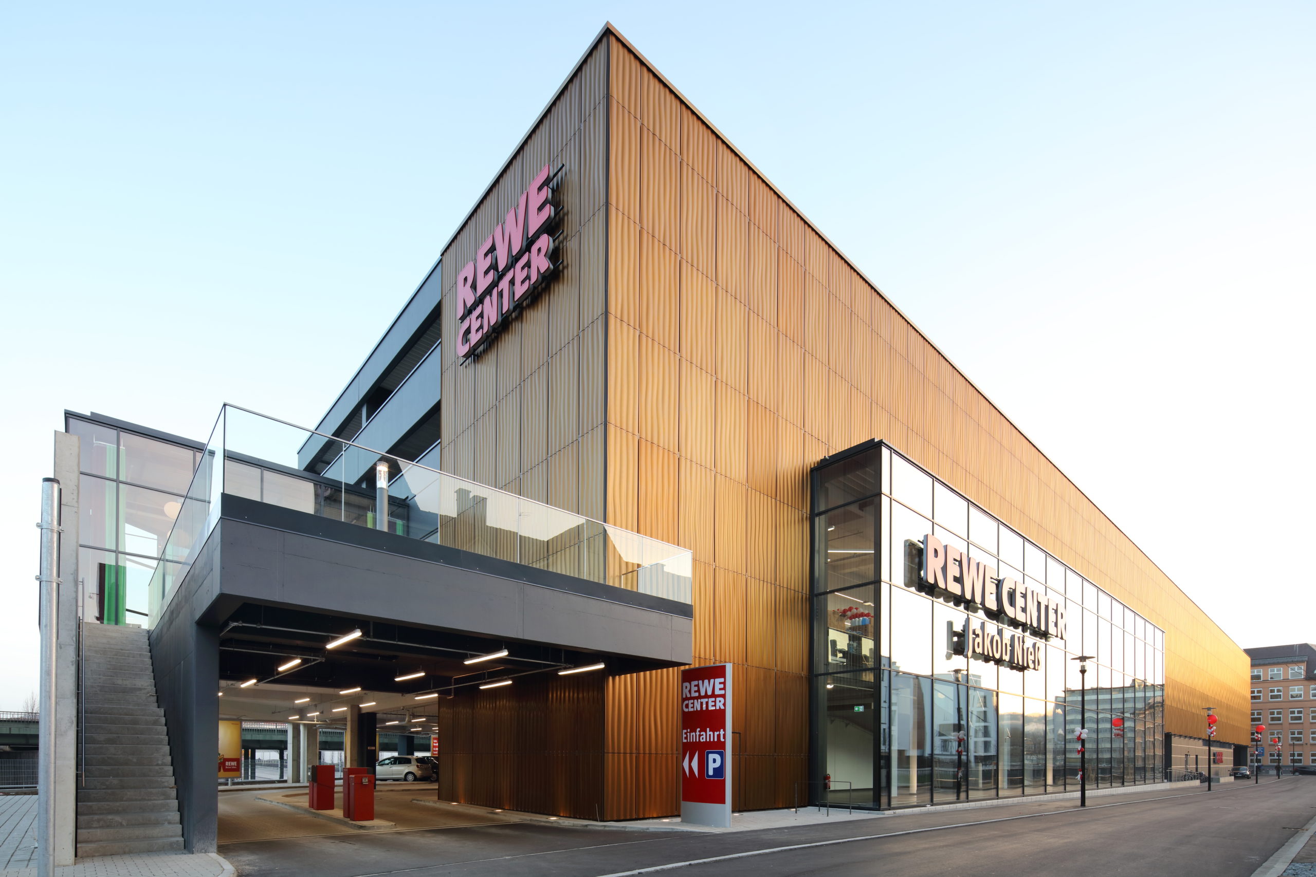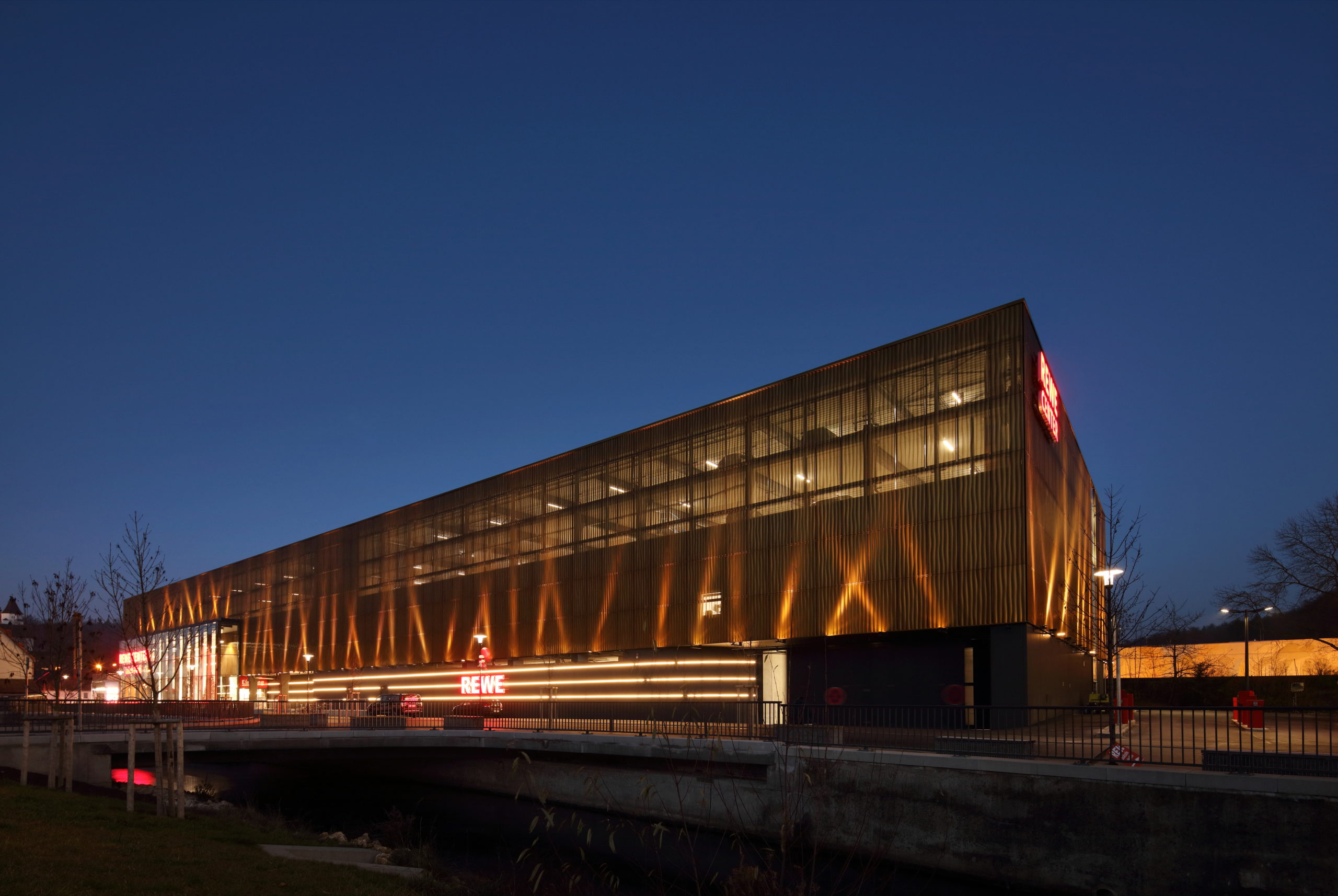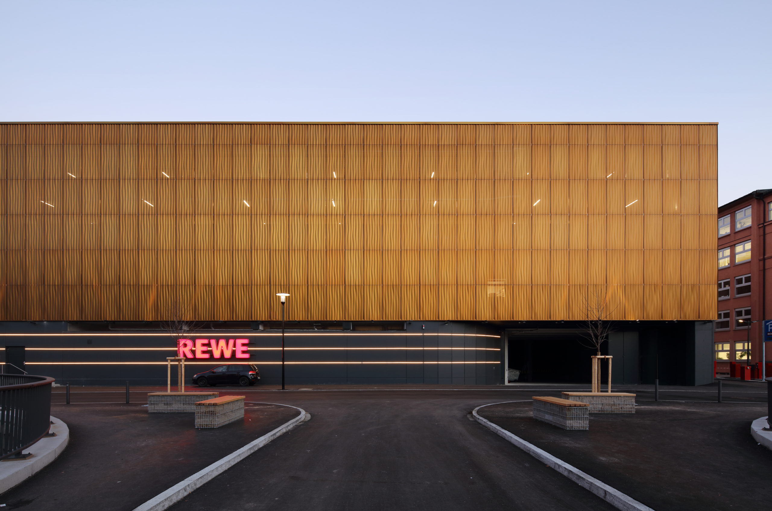 Die 3D Platten Typ „Wasserwelle RH“ mit vertikaler Verlaufsrichtung sind eine Spezialanfertigung nur für dieses Großprojekt. Das gesamte Gebäude wird von einer individuellen, goldenen Welle umhüllt. Die Fassadenpaneele aus Aluminium sind gold eloxiert und gelocht.