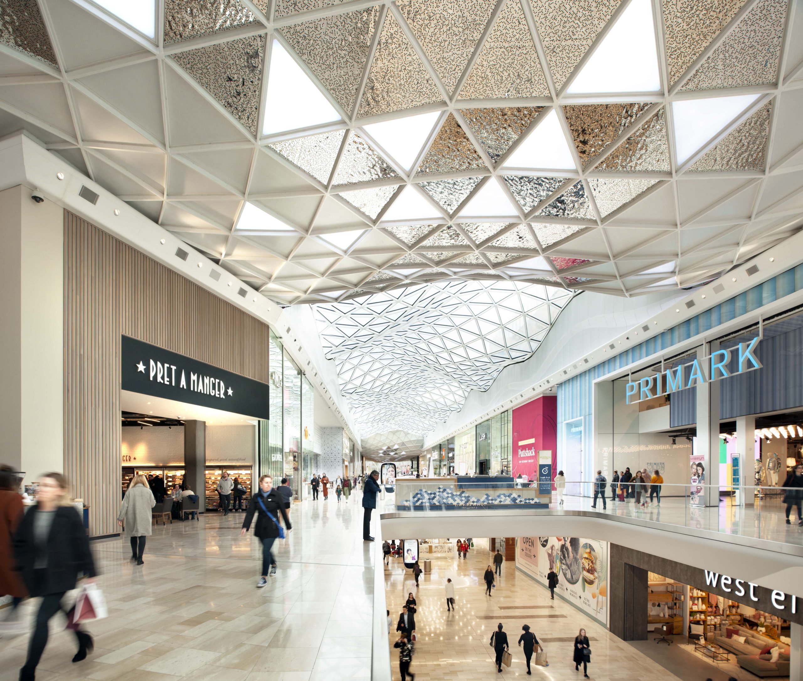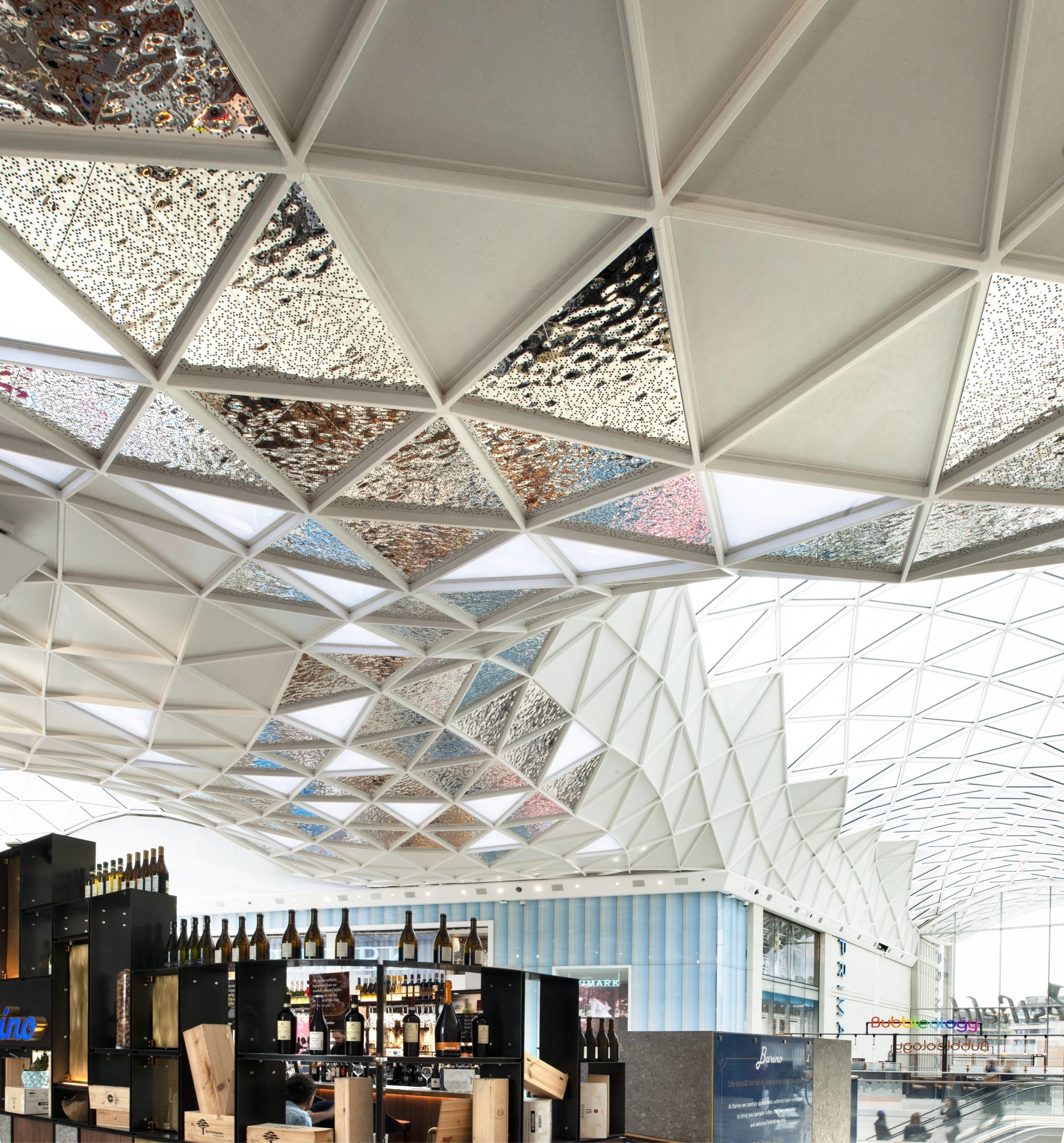 Im Zentrum von London, auf einer der größten Baustellen Europas, wurde ein neues Einkaufszentrum mit einer Baufläche von mehr als 350.000 Quadratmetern fertiggestellt. Weit mehr als 250 neue Geschäfte, sowie diverse Restaurants und Kinos sind in diesem Bauwerk der Superlative untergebracht. Eines der Highlights und ein besonderer Blickfang ist die außergewöhnliche Deckenverkleidung der Einkaufspassage. Hier wurde unser Produkt „Düne small“ aus spiegelpoliertem Edelstahl mit individuell chaotischer Laser-Lochung eingesetzt.